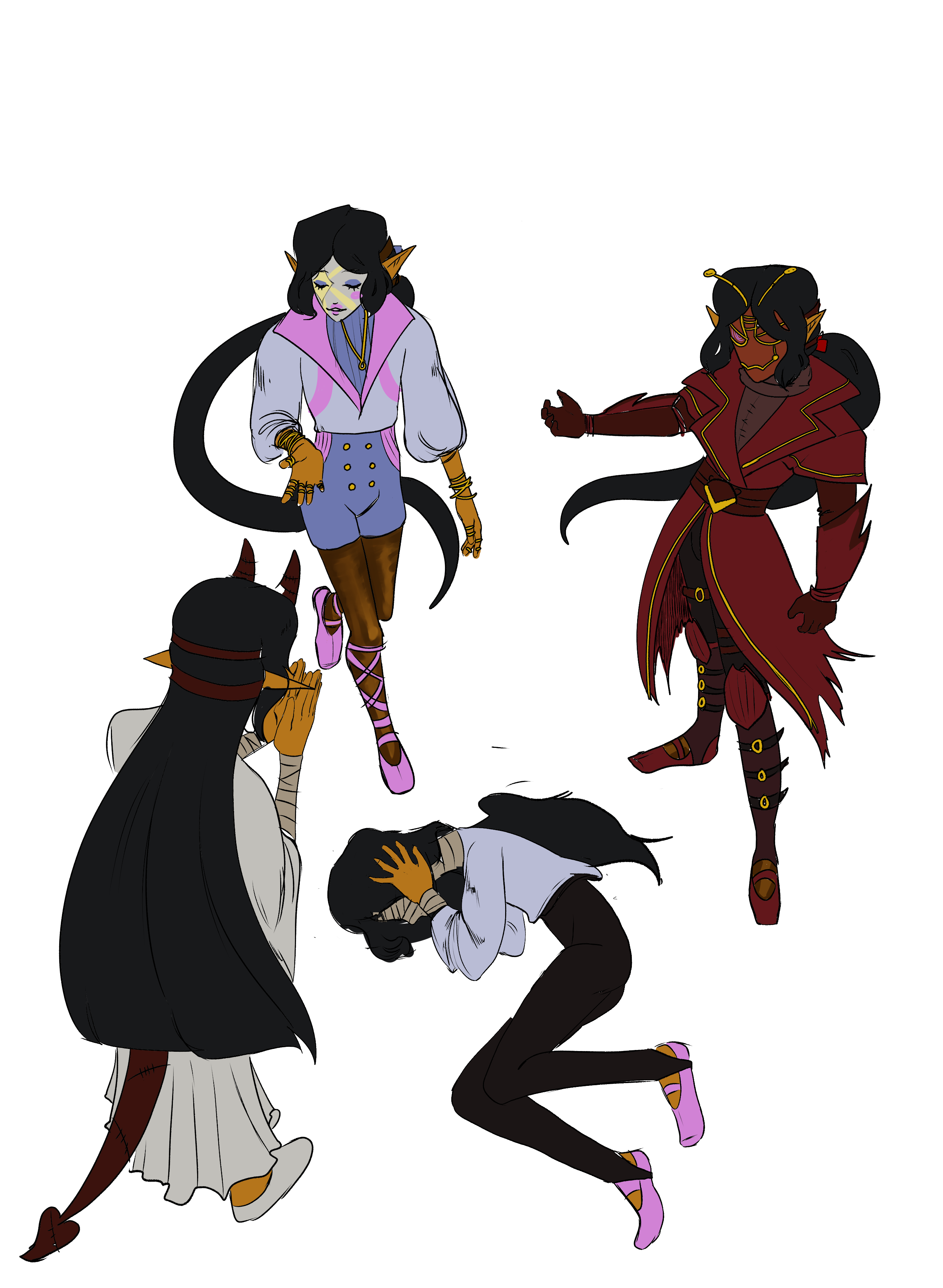 art of my d&d character -- who has D.I.D and each alter is a different class! the red charater is hellsing ( fighter / rouge ) pink and blue is carmilla ( bard ) , white is Mary ( artifcier ) and on the floor is the host <3