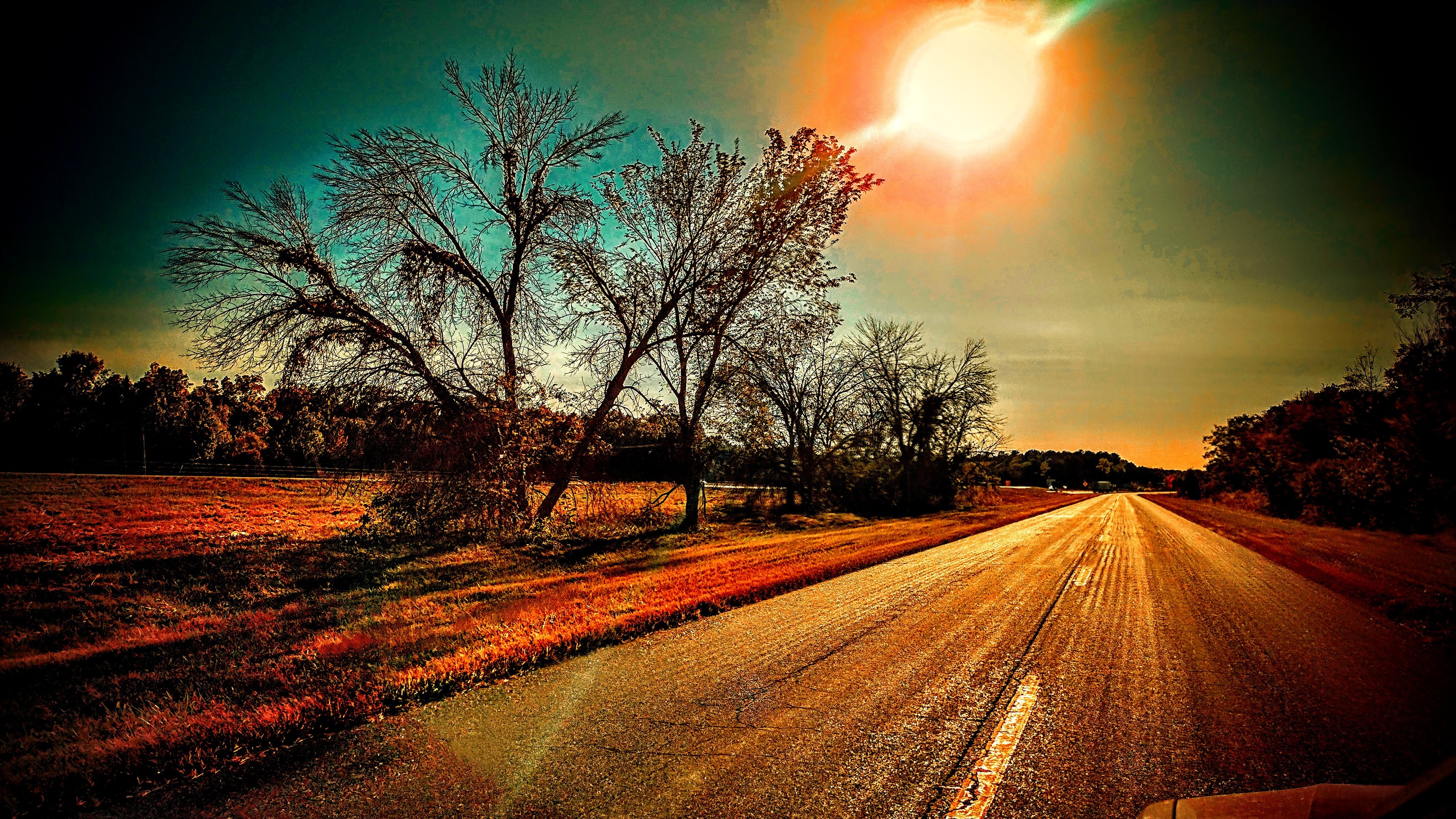 Old unmaintained side road along interstate during an evening sunset starting to occur. Several adjustments using ONLY basic camera features. No apps, no editing software, NO AI. Just straight photography with tones, shades, saturation adjustments. Hope you enjoy!