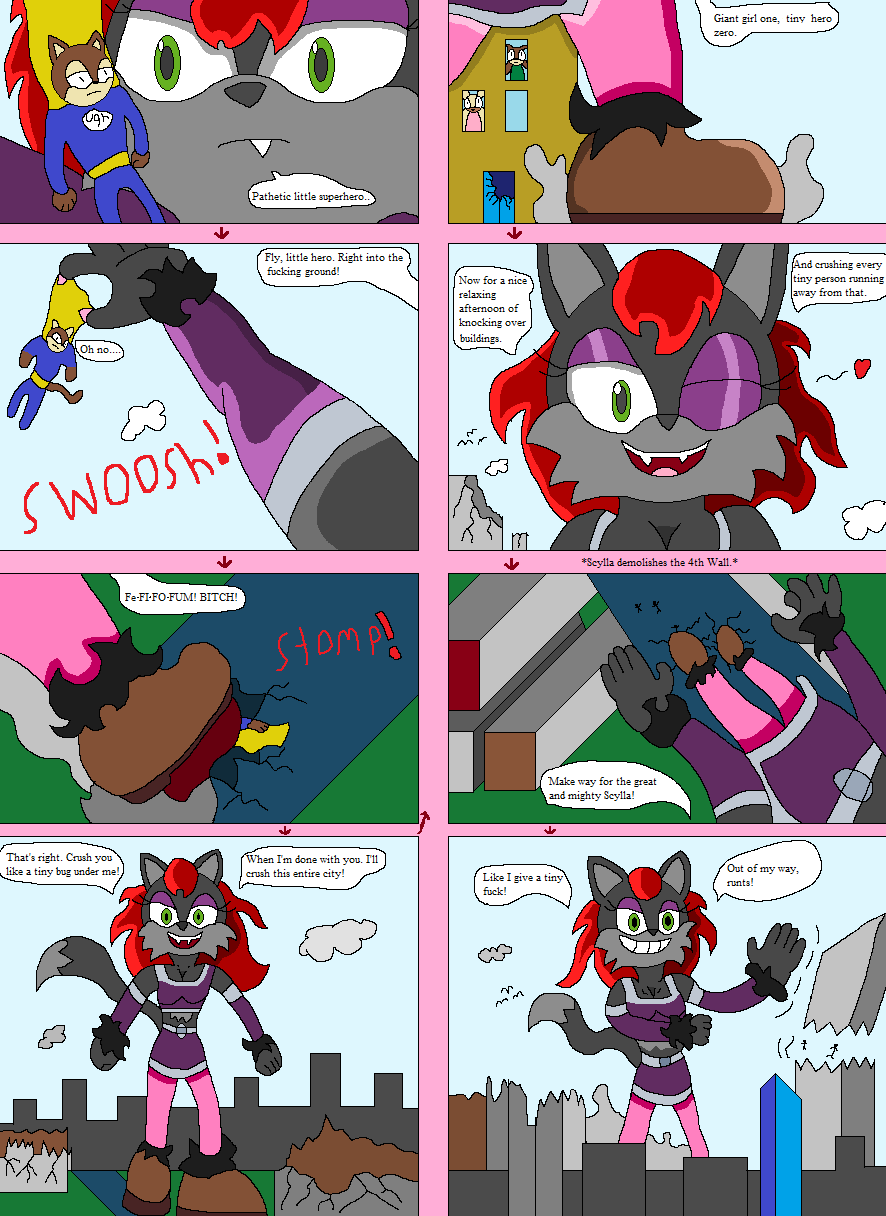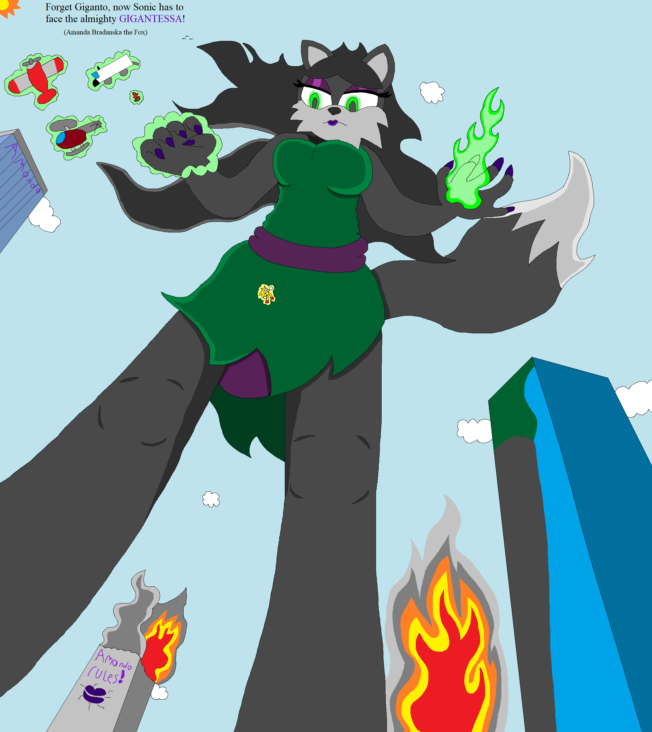 As Sonic would close in rapidly to try to punch at her chest or face, Amanda would make ready her attacks. This time things would be different, this time she wasn't the weak little witch she's been. No, this time Sonic would fall right into the titanic vixen's sinister trap..Sonic had barely evaded the glowing green flames of Amanda's witchfire. He would swerve at unbelievable speeds to dodge her mystical attacks. All the while with her other gigantic hand Amanda was using her naturally born telekinesis to lift up various objects in the city to toss at Sonic, including his own Tornado plane! "Give up Amanda! I don't care if you're the size of one of Egghead's robots, you're still going down like the rest of them!" Super Sonic demanded from her. "Not this time, Sonico! This time I will make you pay for mio past defeats!" It was true that Amanda had thought of retreating, perhaps dashing way with mighty stomps as to try to see if she could lose Sonic. However, running away from his super form and at her bulky height would be nearly impossible. No, she would make a great day get even better by enacting revenge on her most hated foe. Besides, Amanda had various methods to deal with Sonic now. She could use her telekinesis to trap him, she could set him ablaze with her magic, or simply give him the smacking she's waited years to swat him with! As Sonic would close in rapidly to try to punch at her chest or face, Amanda would make ready her attacks. This time things would be different, this time she wasn't the weak little witch she's been. No, this time Sonic would fall right into the titanic vixen's sinister trap..0 Comments 0 Shares 11 Views