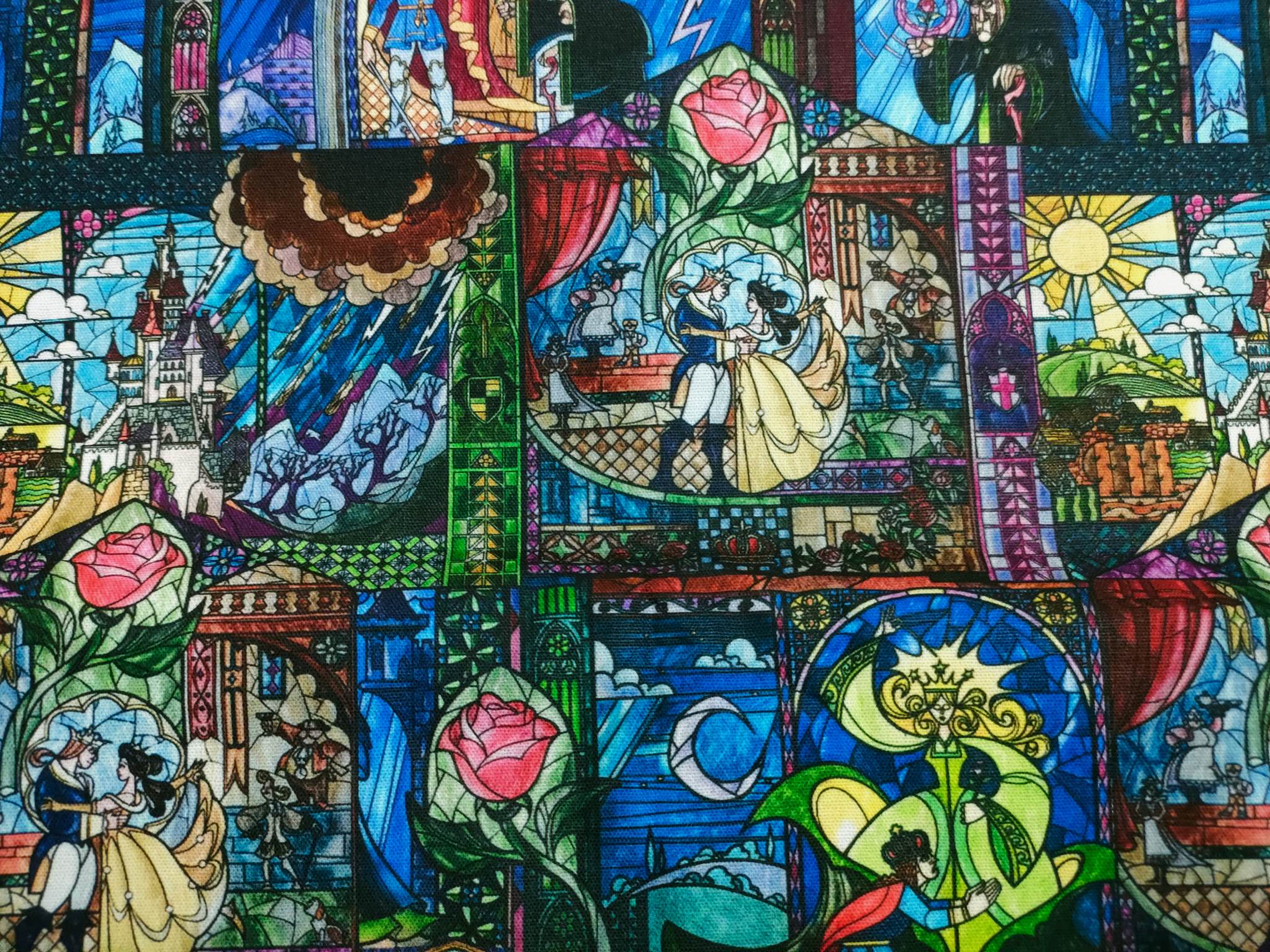 A few years back, I was in the magical land of Tokyo Disneyland. There I saw the most beautiful print of the stained glass from Beauty and the Beast.