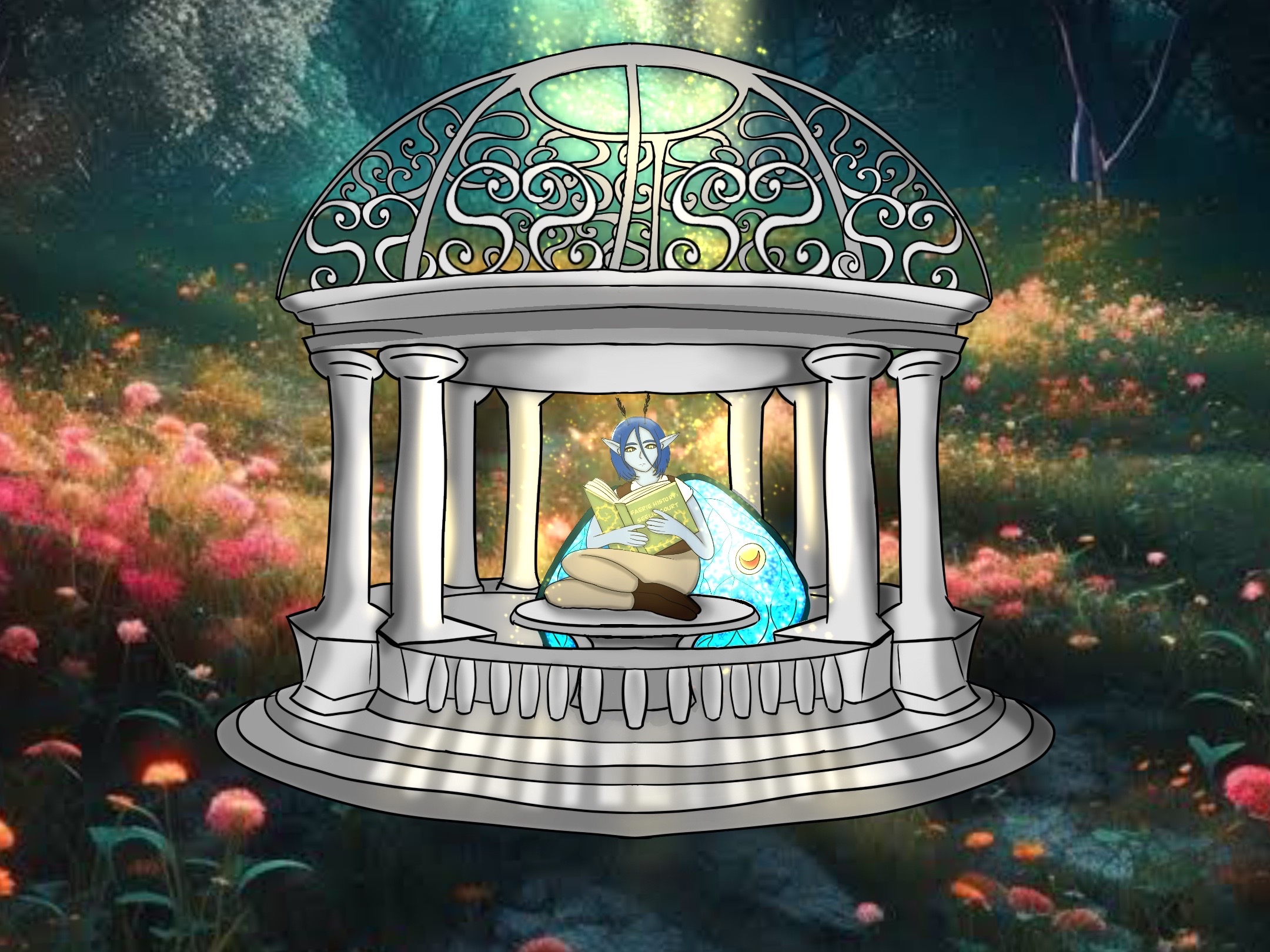 Sitting in their gazebo reading the history of the Seelie fae. Kit, ever since learning to read, has been a voracious reader. When they are able to get their little hands new knowledge they will read until they have at least a basic understanding about the topic.