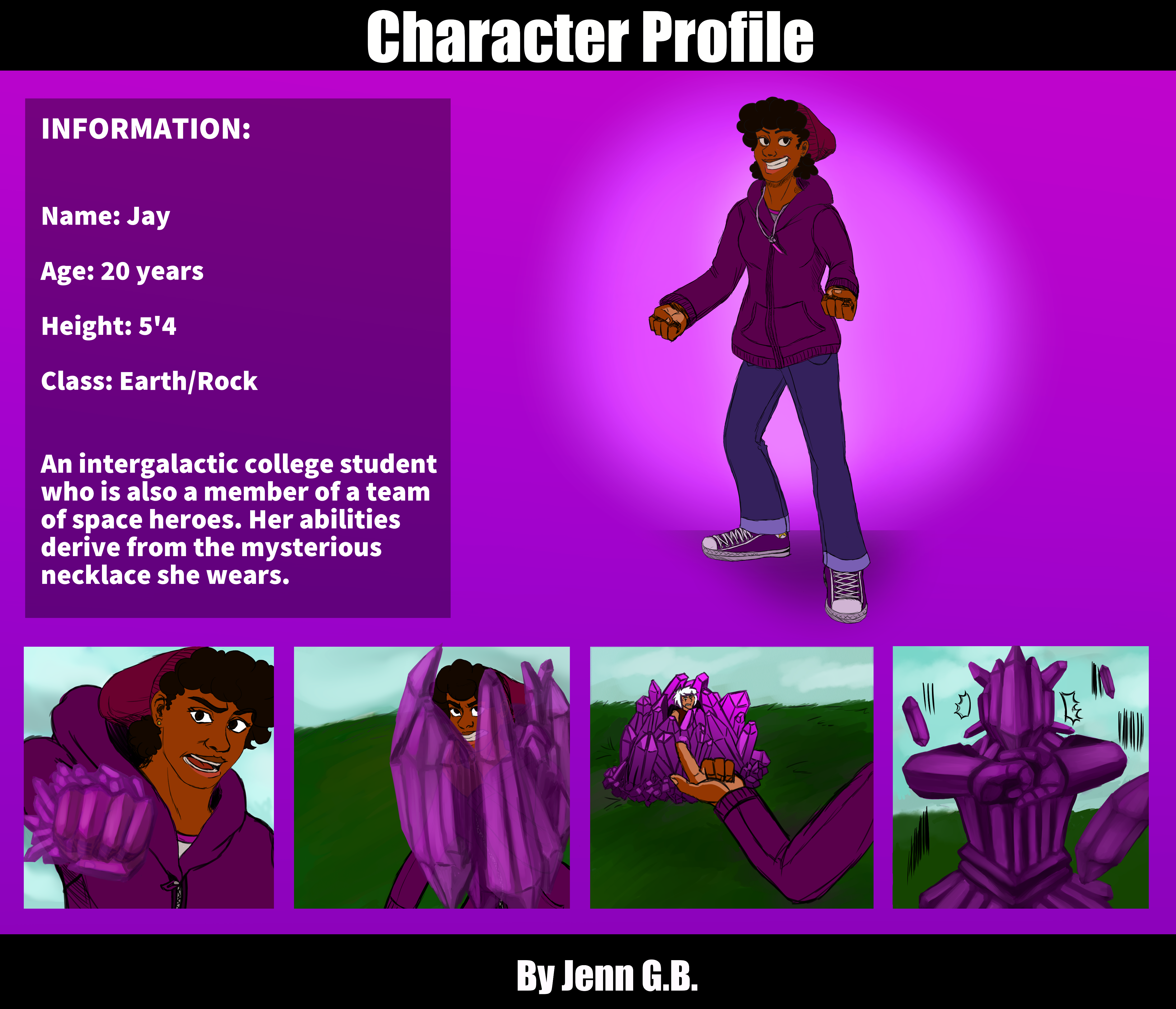 A 20 year old intergalactic college student who also doubles as an intergalactic superhero. Her powers come from the crystal she wears which allows her to form purple crystals for defense and offense, and allow her to travel back in time when ever she feels her powers are needed. Her powers attract many allies and many foes. [2022 Edit: Pronouns he/she, Jamie's Bigender so uses Jamie and Jay interchangably]