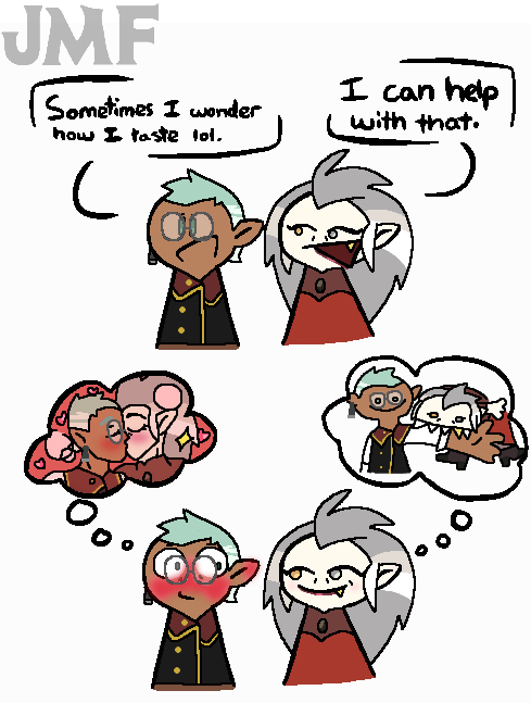 so I figured I'd do a redraw of the "I wonder how I taste lol" meme, but with Raine and Eda (They're so fuckin cute),