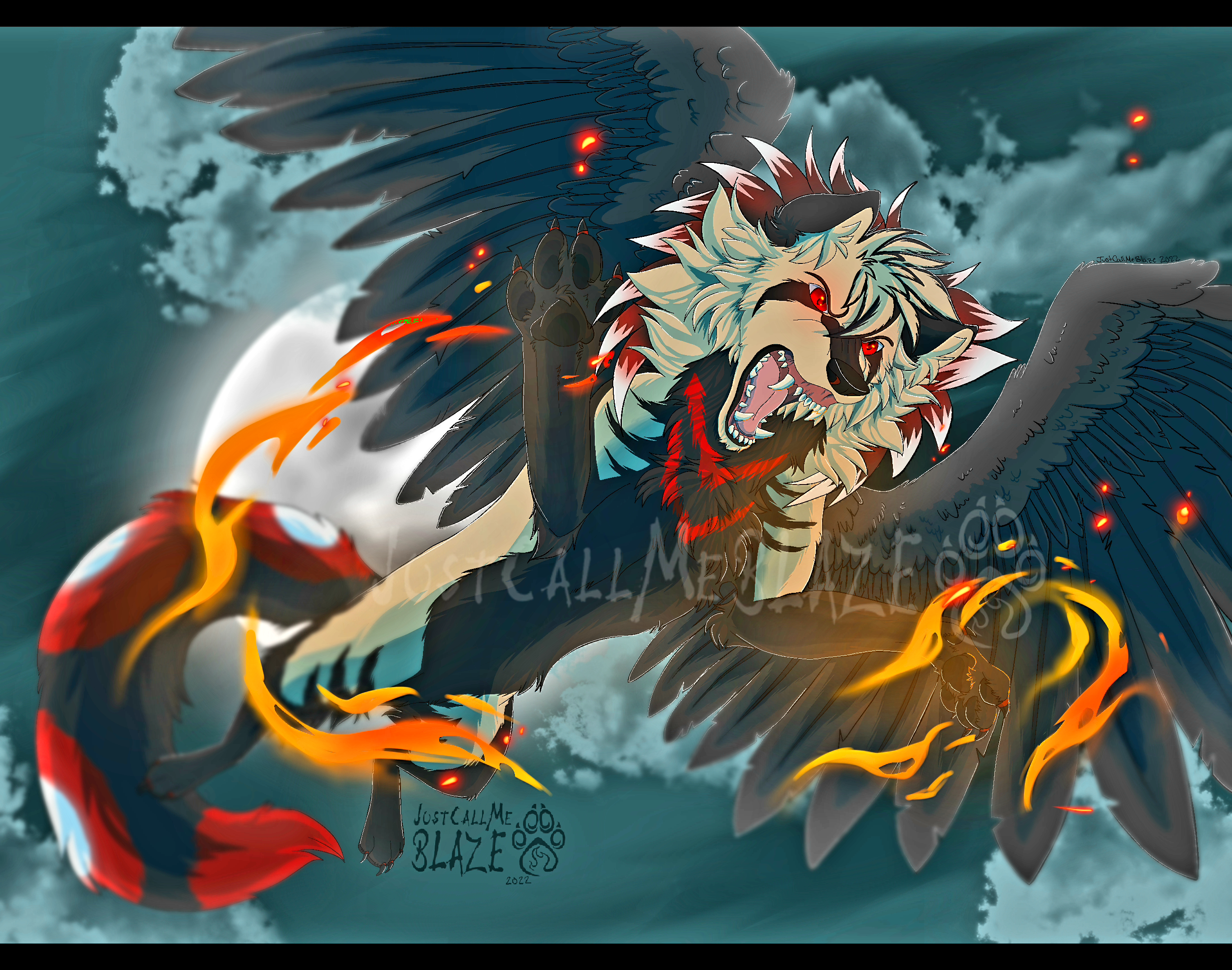 The clouds above wash over the moon, stealing away the last bit of light just as a darker shadow looms over you. You flip onto your back just in time to lock eyes with the glowing red orbs of a great, black winged wolf above you. Sharp, white teeth glint brightly against the darkness. Brilliant orange flames dance around its body as you draw one final breath. You are sure it's the final thing you'll ever see.