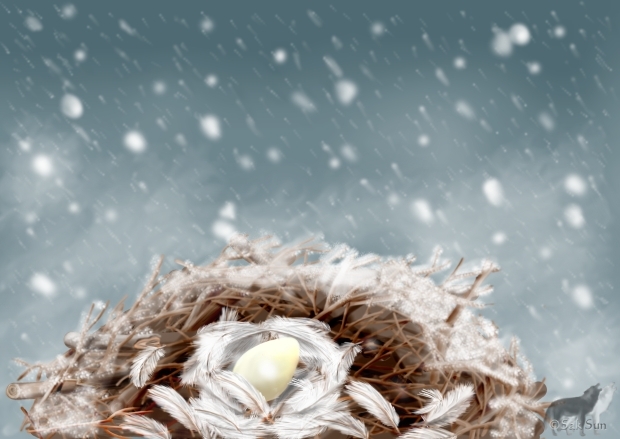 An egg in a snowy nest. Digital art made with GIMP and Aiptek tablet.