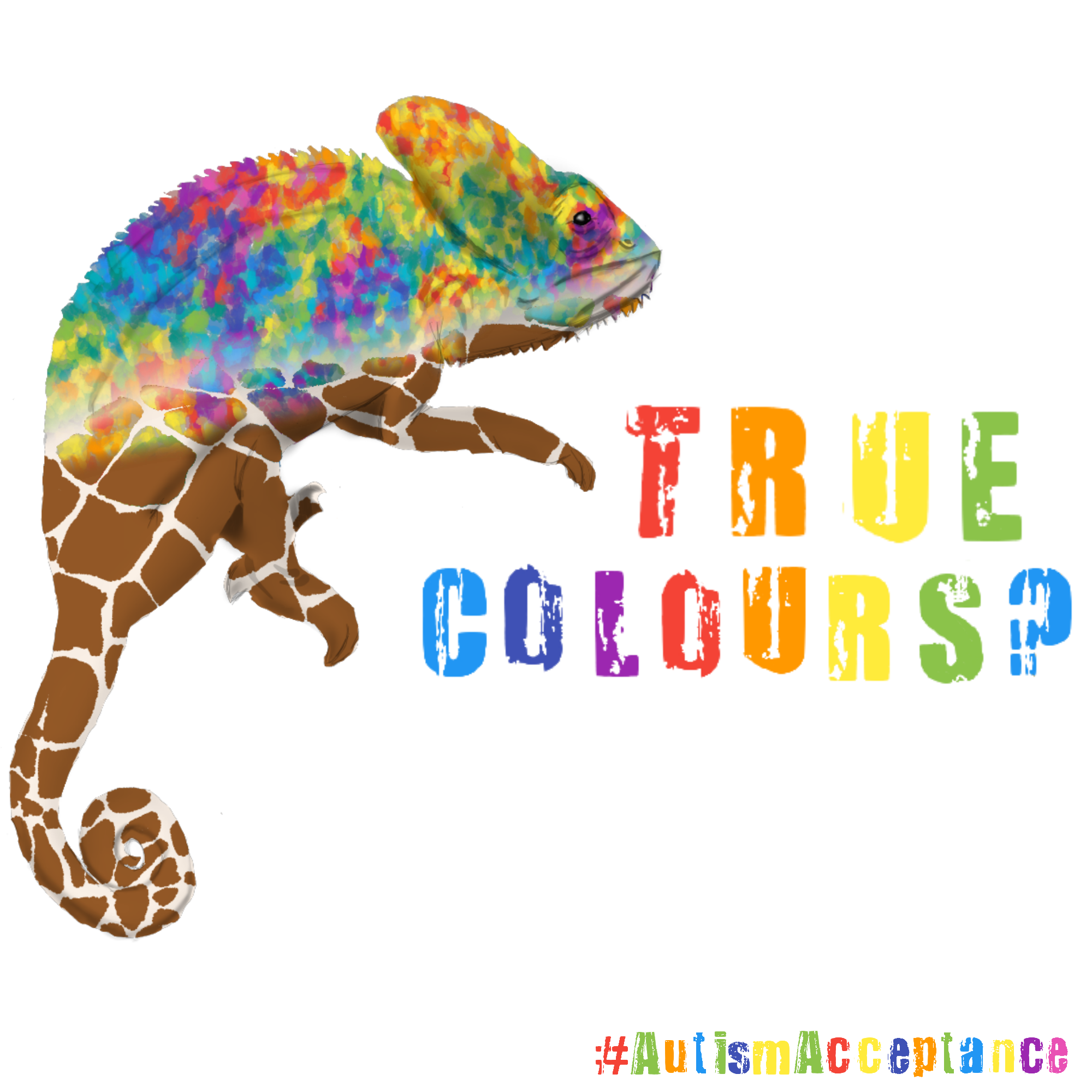 T-shirt design made on a Kindle Fire for autism acceptance month. A chamaeleon morphs from a giraffe pattern into multicoloured splotches with the caption "True Colours?".