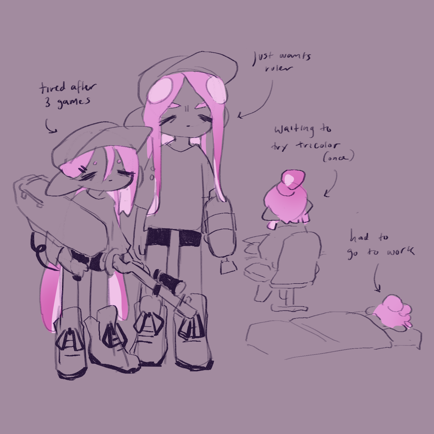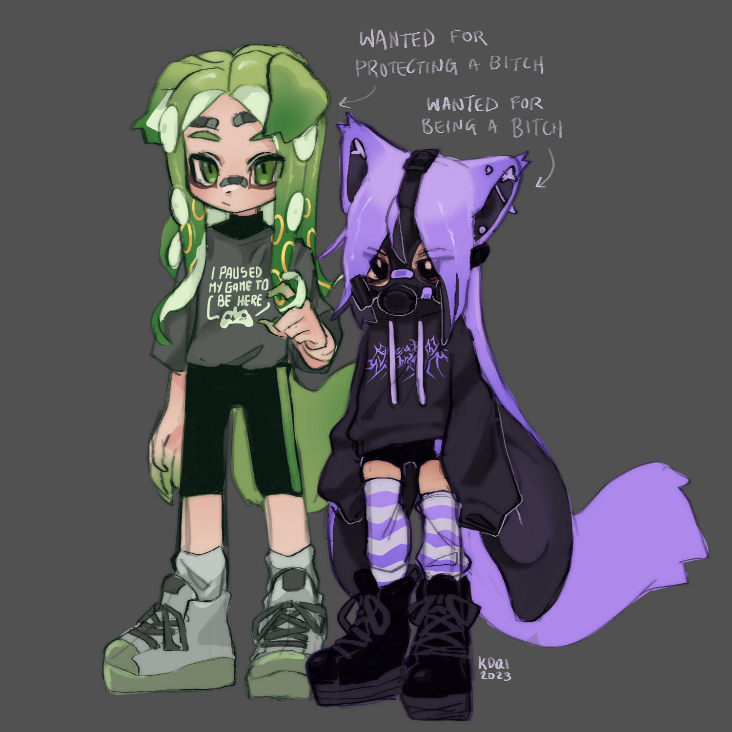 we often duoq as backliners so i felt like drawing our charas. purple is mine, green is his (got the privilege of designing his chara hehehehaw)