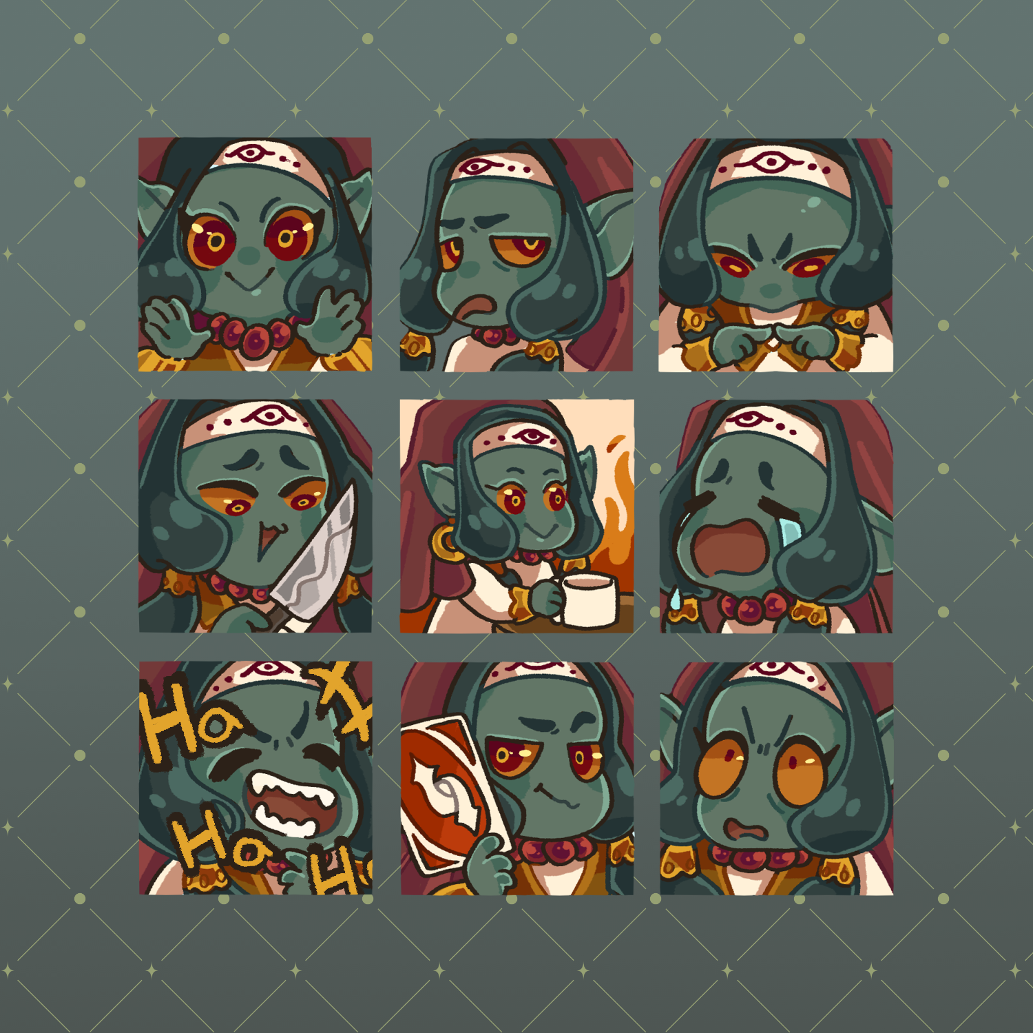 Emote sheet I made for my goblin girl, Cecilie