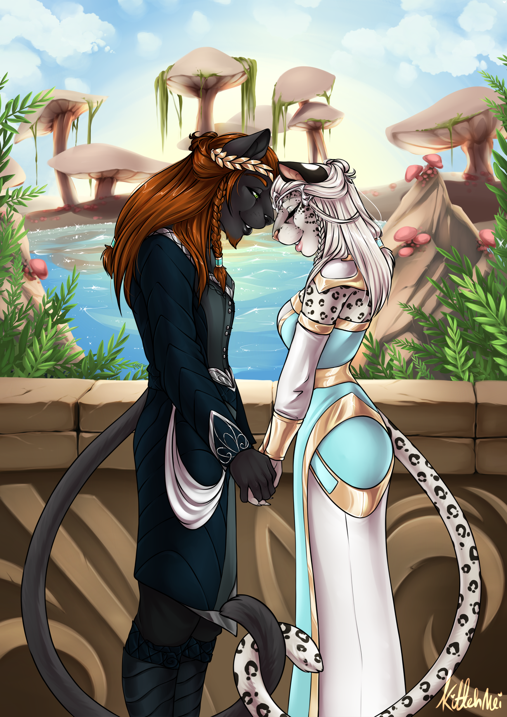 _Art from 2020_ ♥ ------ Illustration commission for [PiercedPixxie](https://www.furaffinity.net/user/piercedpixxie) of their ESO Khajiit ♥ A sweet khajiit couple, sharing a romantic moment against a warming Morrowind sky~ ------ Art © KittehMei || Characters © PiercedPixxie > Do not re-upload this on other sites without credit and source, thank you ♥ You do not have permission to use, copy, trace, steal, scrape, etc. etc. this artwork. If you would like to use this or any of my works please feel free to contact me :)0 Comments 0 Shares 31 Views -