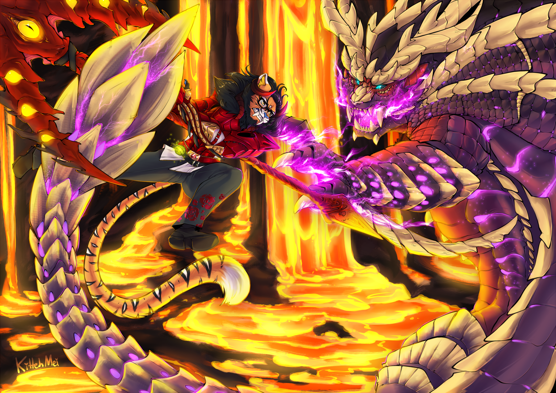 ---- Illustration commission for [TheBlazingTigre](https://twitter.com/TheBlazingTigre) ♥ _We are finally up to date with 2023 art things._ I love Monster Hunter, so when I was asked to do this I was really excited! I wanted to use hot vibrant colours with this since I have had a bad habit of being a little too cautious with my dull colours and pale values.. and this is a fight within a deep lava cavern x) Here's kitteh trying to get some shiny going! I hope you enjoy!! Let me know what you think ^^ ------ Art © KittehMei || Character © TheBlazingTigre || Magnamalo © Capcom > Do not re-upload this on other sites without credit and source, thank you ♥ You do not have permission to use, copy, trace, steal, scrape, etc. etc. this artwork. If you would like to use this or any of my works please feel free to contact me :)0 Comments 0 Shares 33 ViewsPlease log in to like, share and comment! -