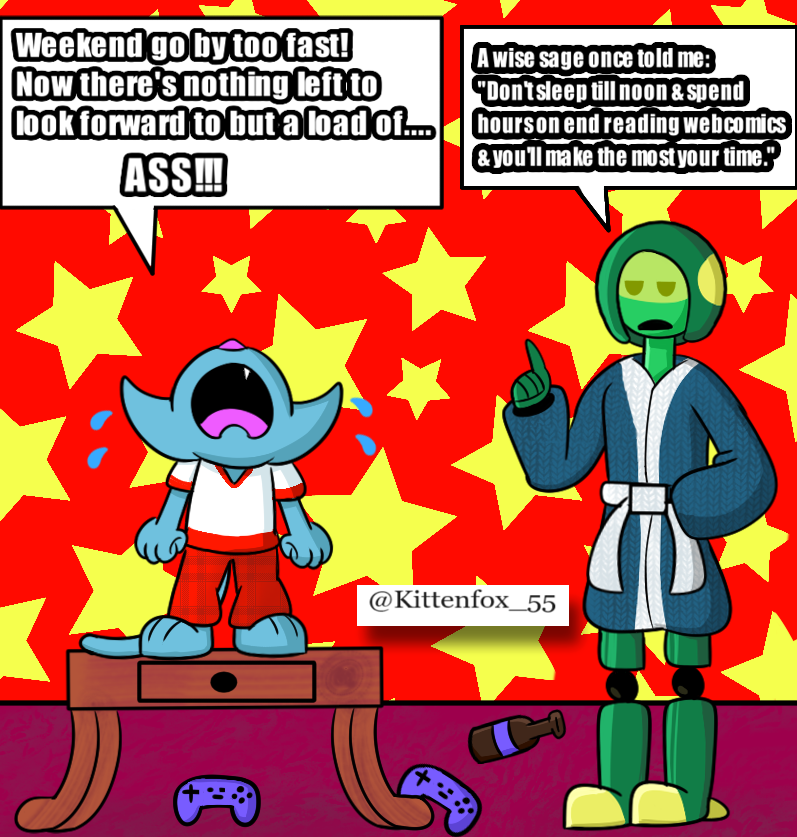 This is the kinda joke you come up with a late on a weekend with friends while hyped up on salty snacks. But I think we've all experienced something, we all don't want to go back to work after having just a few days off (especially after if you get an extra day) but even more so when you feel like you've wanted to get some things accomplished but for one reason or another it doesn't happen. Maybe Cerulia needs better time management skills. And Upsilon is giving her some advice on where to start, He's so supportive of her.0 Comments 0 Shares 27 Views -