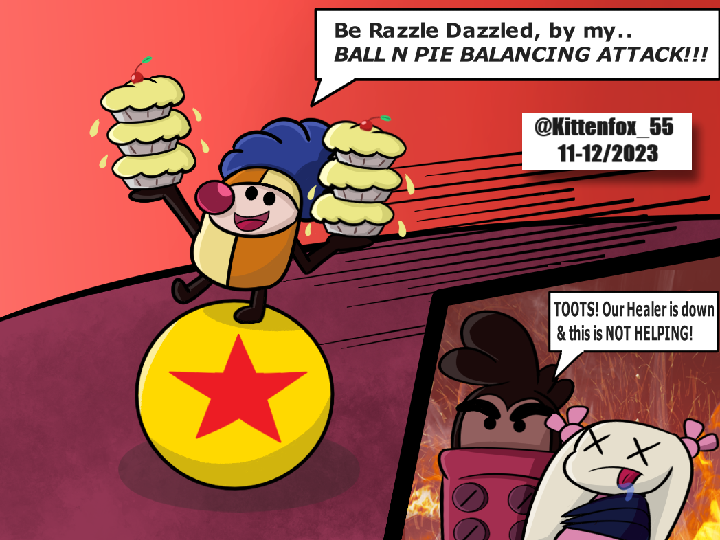 Thought about making more fanart for Indie animated series, Took inspiration from NOXP. An underrated little series made by the guy who made Planet Panic. It's about 5 heroes in an RPG like world and their daily lives after they've defeated the great evil. One of them is a Clown named Toots whose dedicated her life to the art of buffoonery (Her own words). I'd imagine this is something she'd do in a fight. The creator Gene-Goldstein is actually on Newgrounds and so are a few of this episodes thought most of the series is on YouTube so check em out there. Also don't worry about Poppy she gets revived.