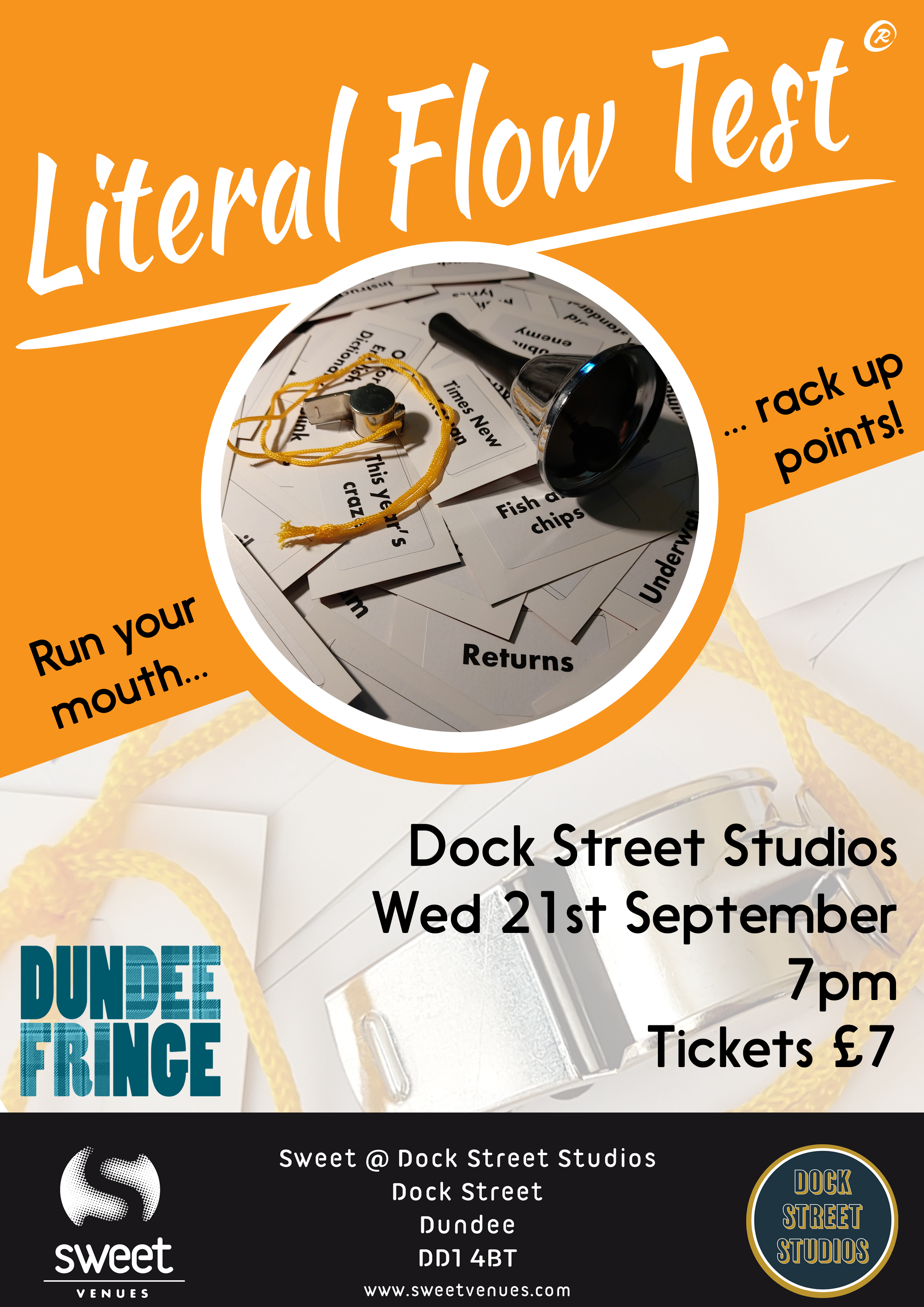 My poster design for the Dundee Fringe performance of 'Literal Flow Test,' a time-based parlour game where participants try to speak uninterrupted on a subject, in a similar vein to the BBC Radio 4 classic 'Just A Minute.'My poster design for the Dundee Fringe performance of 'Literal Flow Test,' a time-based parlour game where participants try to speak uninterrupted on a subject, in a similar vein to the BBC Radio 4 classic 'Just A Minute.'0 Comments 0 Shares 10 Views