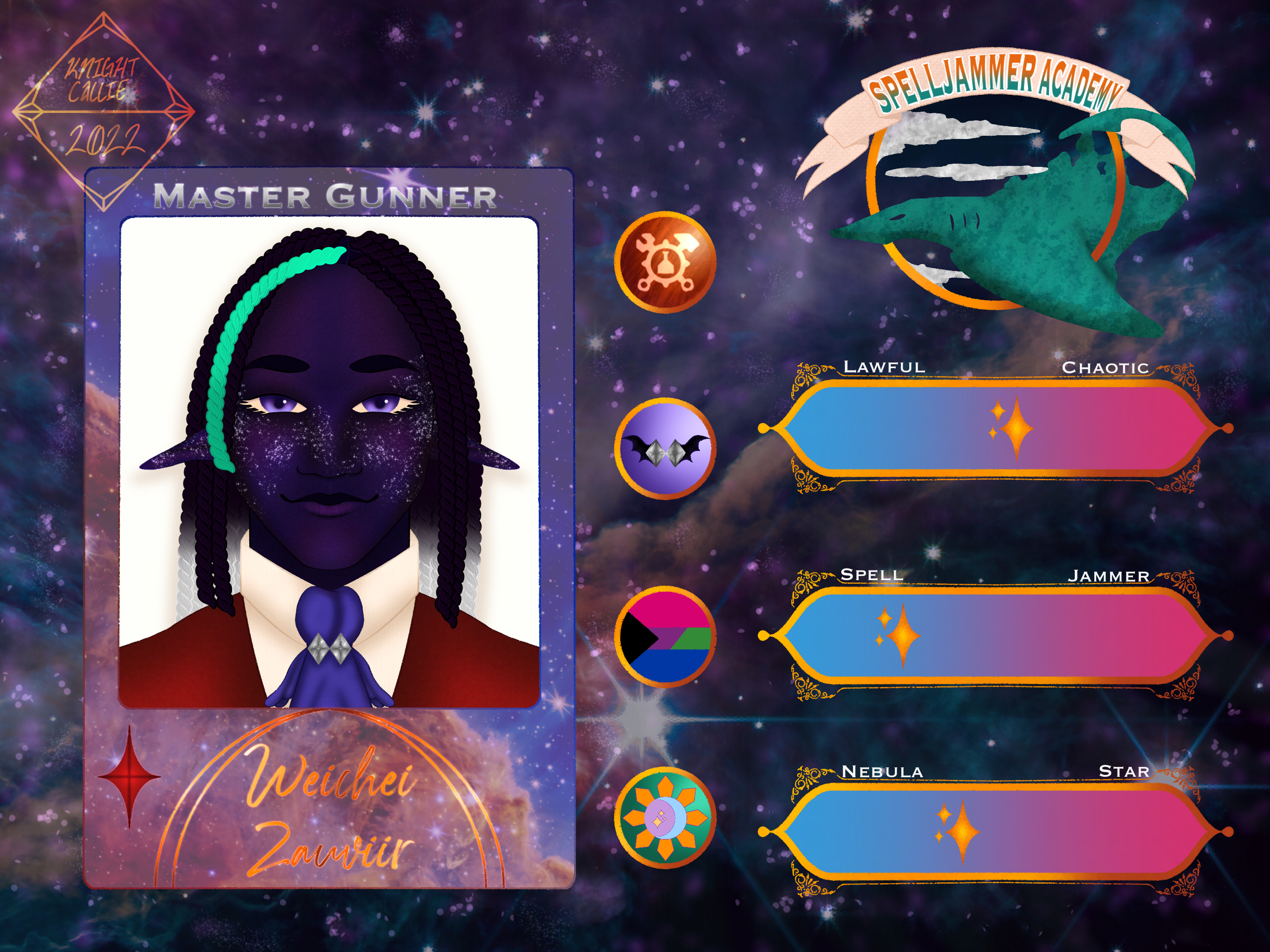 Weichei had a long life, currently 224 years old in this timeline. He has married his childhood friend Temerity back in his 30s and lost him sometime before 150. He lost most of his close circle, but one still stands today with him: Beaulieu Oakin. It’s been a little easier, living, but he had been in mourning for nearly half a century as he lost them. He has met some new people, in bounty trade and out of it. One of his newer friends, Syretia Davina, has recommended he enroll in Spelljammer Academy. She didn’t think a mind like his should be wasted in this trade; and after some internal debate and talking with Beau, he did.Weichei had a long life, currently 224 years old in this timeline. He has married his childhood friend Temerity back in his 30s and lost him sometime before 150. He lost most of his close circle, but one still stands today with him: Beaulieu Oakin. It’s been a little easier, living, but he had been in mourning for nearly half a century as he lost them. He has met some new people, in bounty trade and out of it. One of his newer friends, Syretia Davina, has recommended he enroll in Spelljammer Academy. She didn’t think a mind like his should be wasted in this trade; and after some internal debate and talking with Beau, he did.0 Comments 0 Shares 5 Views