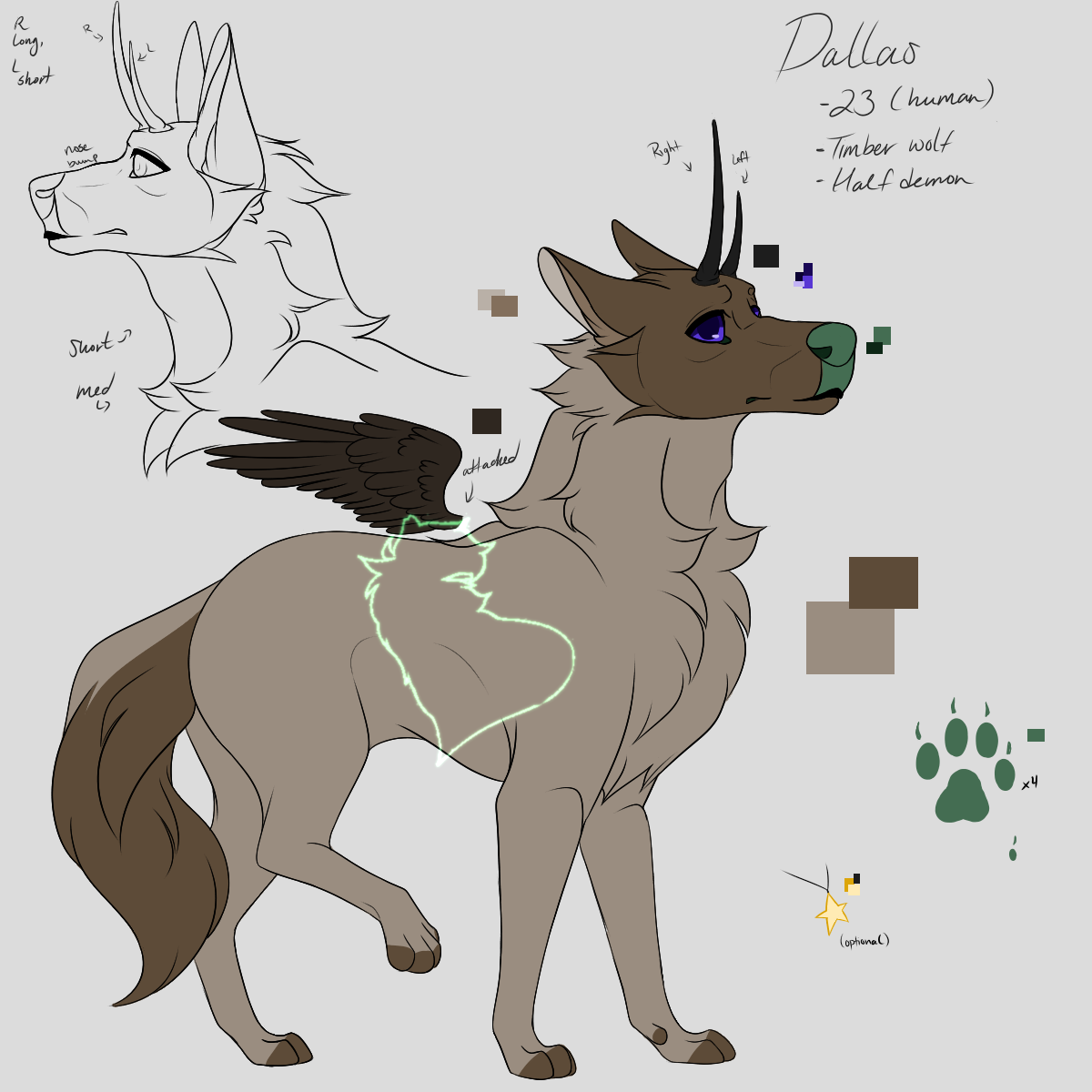 my new truesona is named dallas. theyre a wolf demon hybrid with indigo eyes and a teal nose