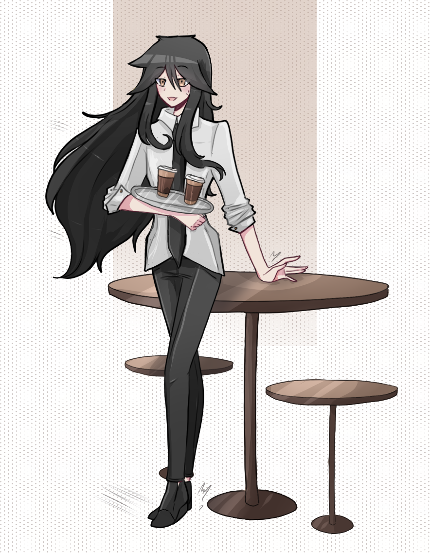 Kori Omoide is the co-owner of a cafe, so I drew her in her cafe uniform, bringing coffee to a table for two!