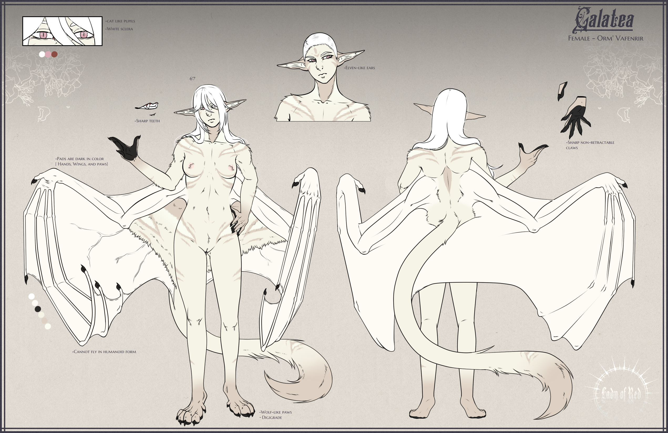 For the Cost of Blood, Ormβ Vanfenrir, and Galatea Β© Lady of Redππ³π’π―πΆ π―π¬π°π’ π₯ππ° π¦π±π° π±π₯π¬π―π«π°. πππ©ππ±π’π π₯π’π―π’ π¦π° π«π¬ π’π΅π π’ππ±π¦π¬π«." Name: Galatea Age: 415 Species: Ormβ Vafenrir Known to be quite the stubborn lass. Despite her sweet face, Galatea has a rough personality. The loss of her parents took a toll on her. At a young age, she isolated herself from the rest of her clan. Afraid to lose anyone else she held dear. Galatea comes off as rude to those who don't know her. She doesn't mean any ill towards anyone. She wants to be left alone- doing her part for her clan. It's rare she bonds with someone, let alone trusts them. Trust is valuable and has to be earned. Protective even- willing to play the tough older sister if she has to. Galatea serves as a hunter for the Tye Varyel, enjoying her time in the forests listening and gazing upon her surroundings. ------ Iβm so glad sheβs done, Galatea is one of many redesigns that I have- sheβs the first to get a reference sheet. Originally she also had headshots showing various expressions but I omitted that. I figured since she is not one of my main characters, so it's best to keep it simple. Sheβs what a typical Vafenrir might look like. Not all of them are covered in fur like she is, most donβt have wings. Now onto more references. ----- For the Cost of Blood, Ormβ Vanfenrir, and Galatea Β© Lady of Red0 Comments 0 Shares 5 Views -
