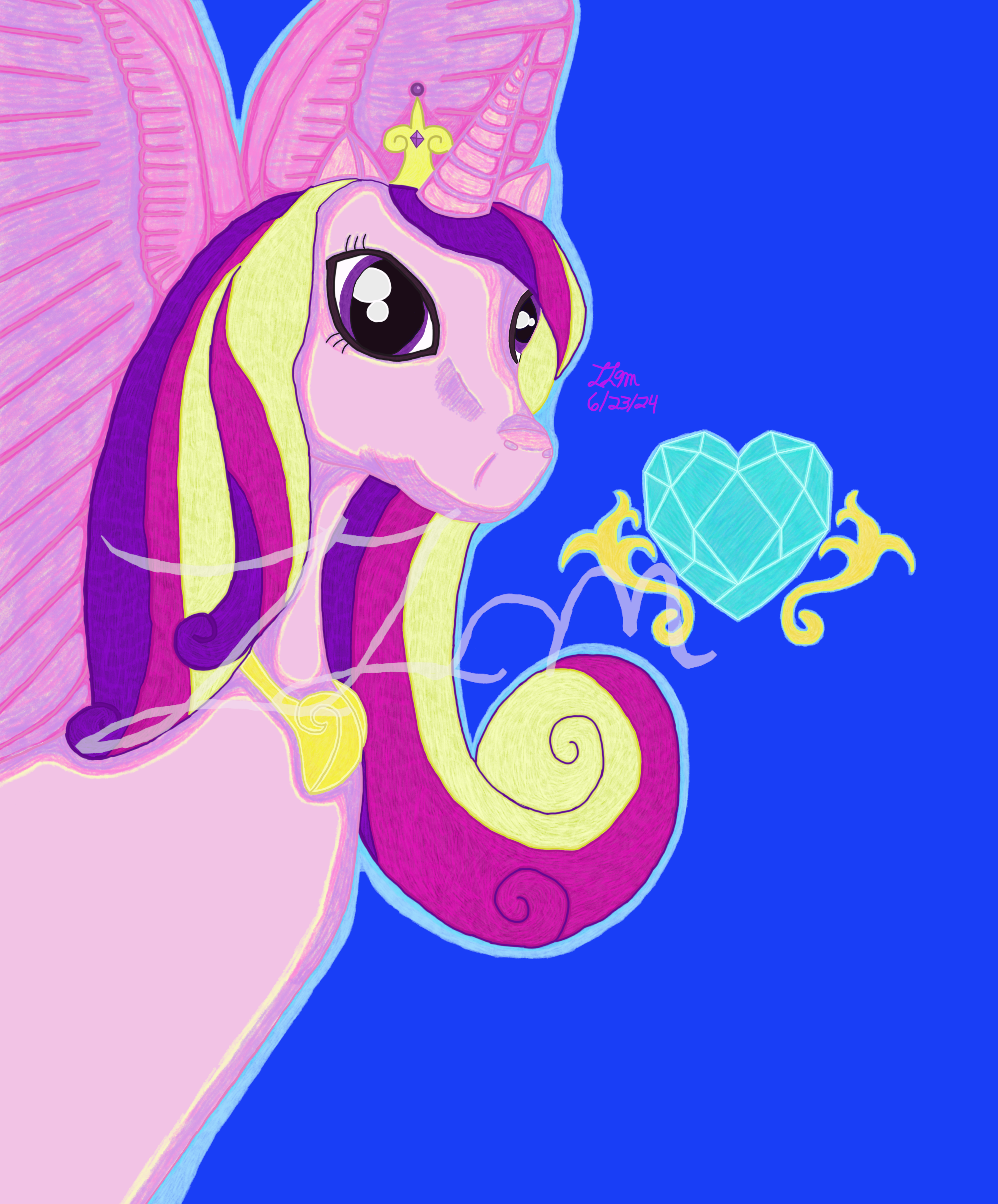 Since I drew Shining Armor, why not draw Princess Cadance? I took some creative liberties with her mane, but it does look like it fits in the rest of her mane style. I also like how her wings look, because I used like three different colors just for the main color, so it wound up looking reminiscent of holographic coloring.