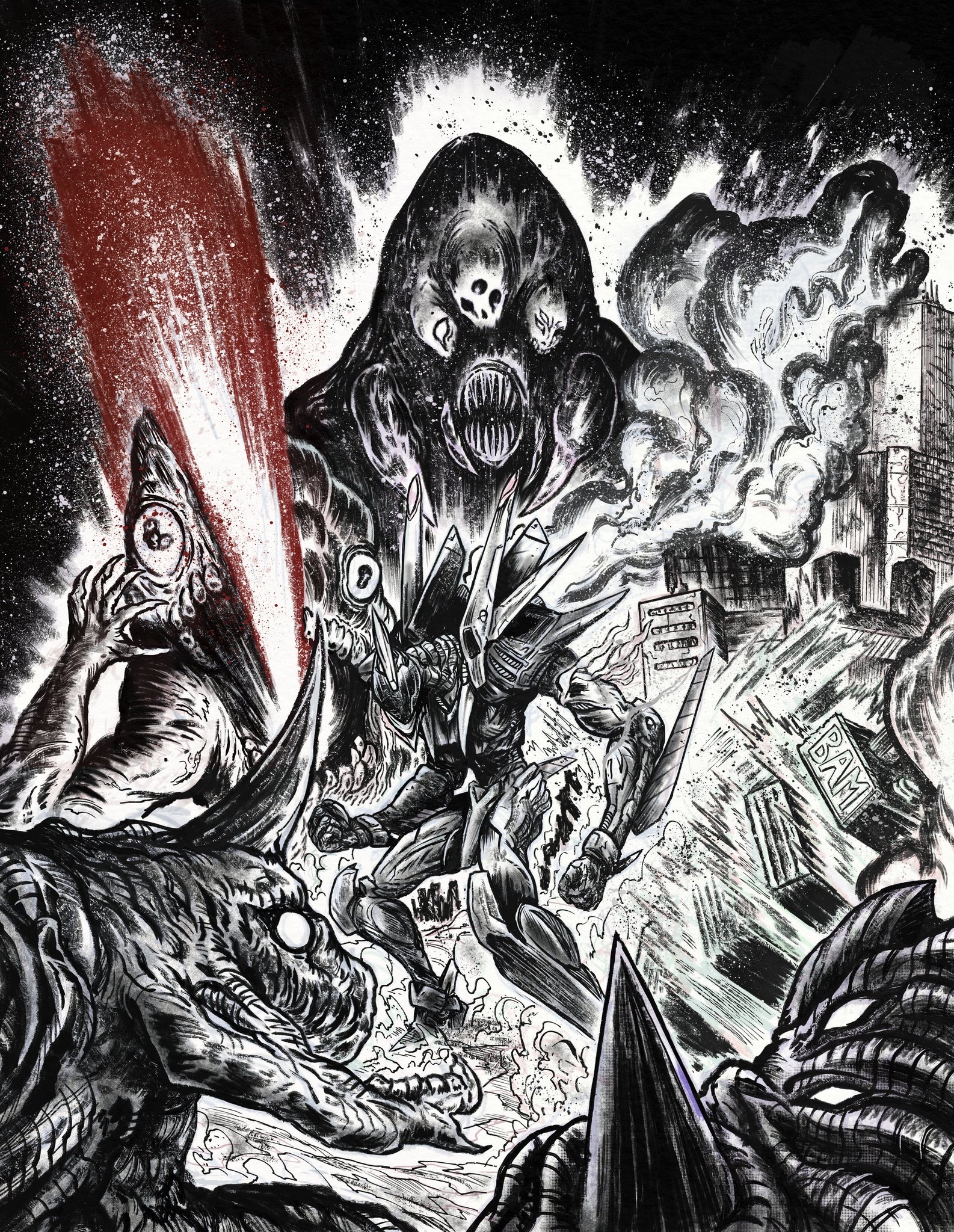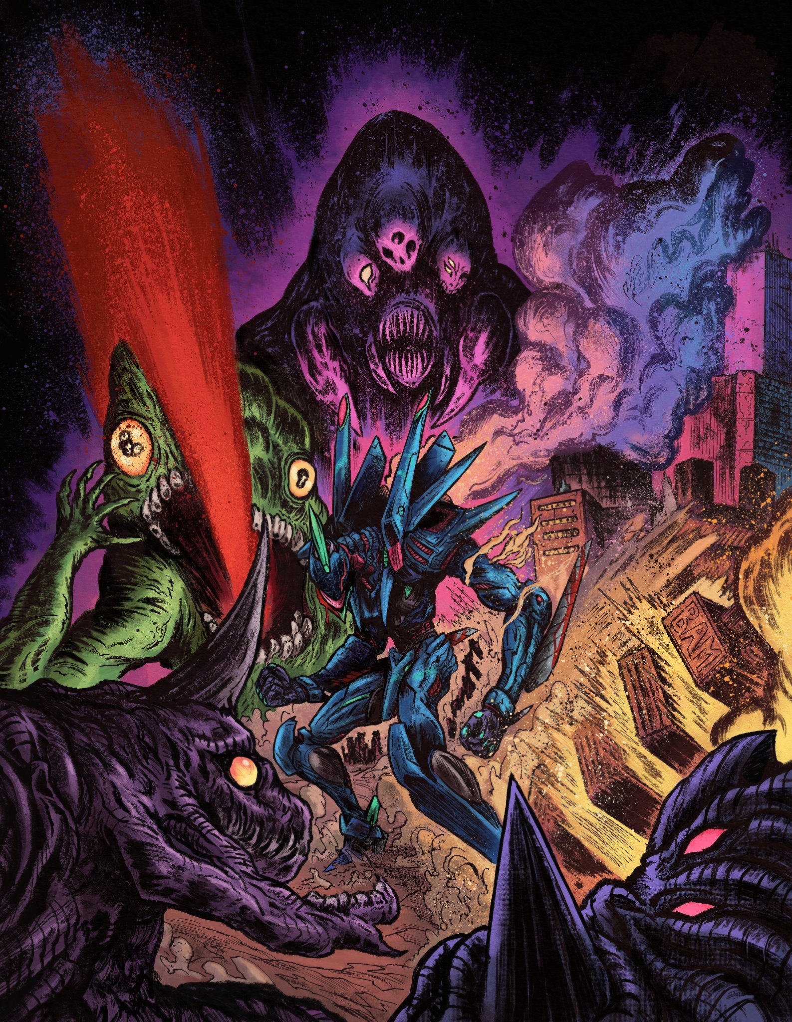 Full Page illustration commission for an upcoming Kaiju och mecha related RPG kickstarter.