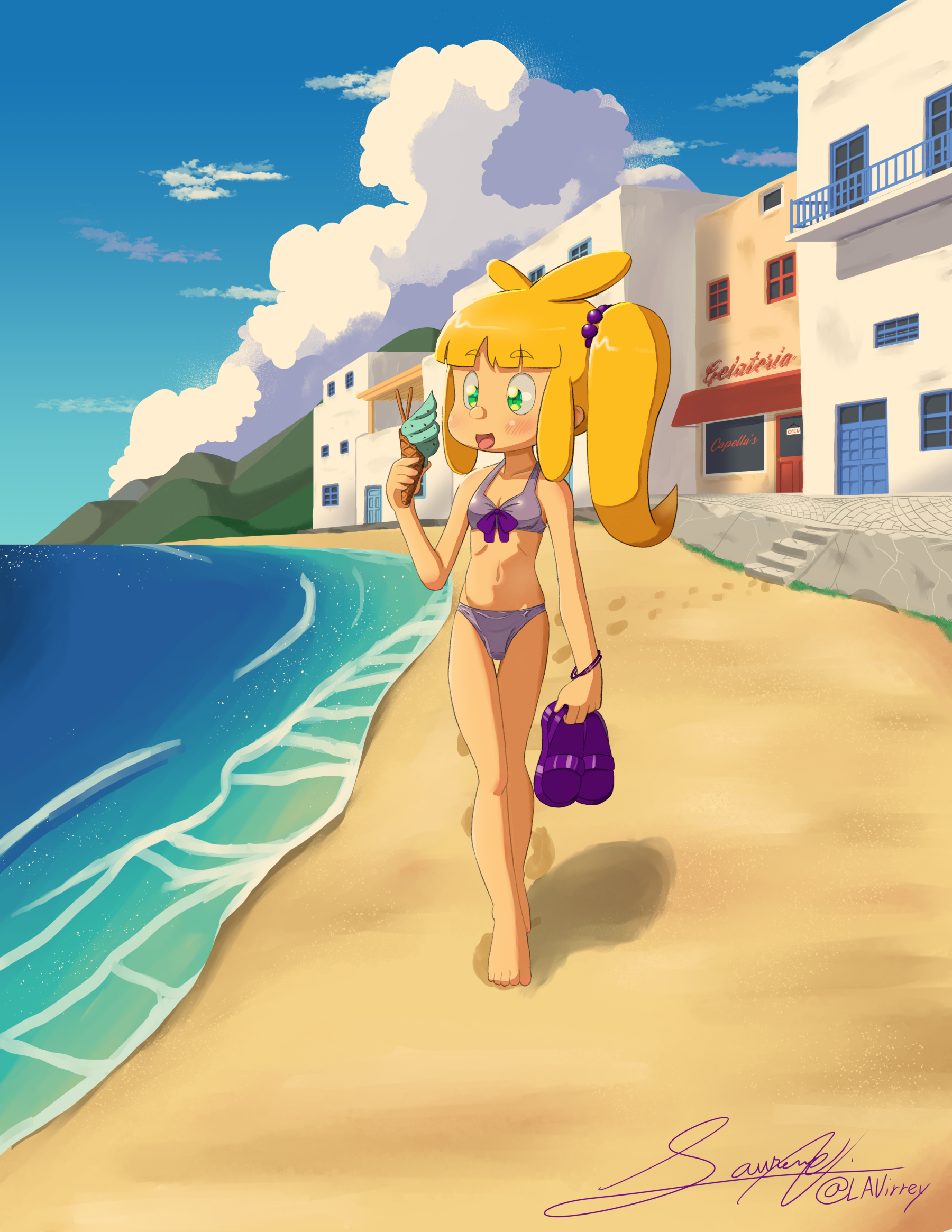 Miette enjoying a mint chip gelato on a beach stroll.I like to draw seasonal illustration with Miette and here is this year's summer version. Next up is Autumn in a few months. Miette enjoying a mint chip gelato on a beach stroll.0 Comments 0 Shares 28 Views -
