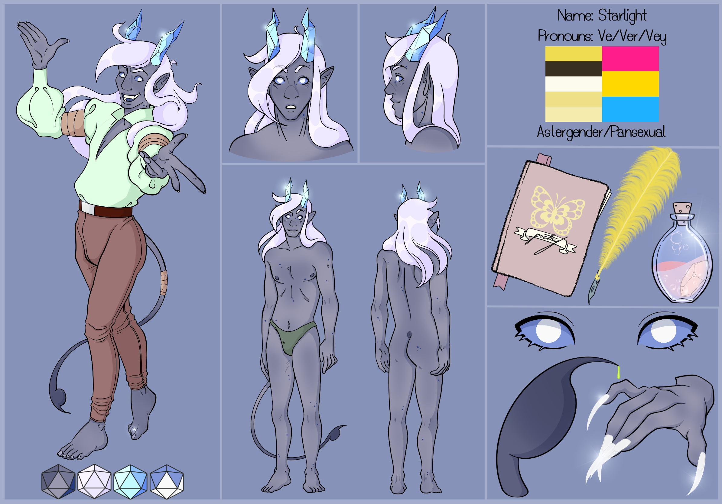 Finished 2023 Art Piece Count: 2Reference page for my newest OC, Starlight. Ve is a College of Eloquence bard who loves puns as much as vey hate shoes. Ve also has a deep fondness for alliteration which leads to ver uttering sentences like, “Forgive me if I fumble but I fail to fathom your foolishness!” Finished 2023 Art Piece Count: 20 Comments 0 Shares 30 Views -