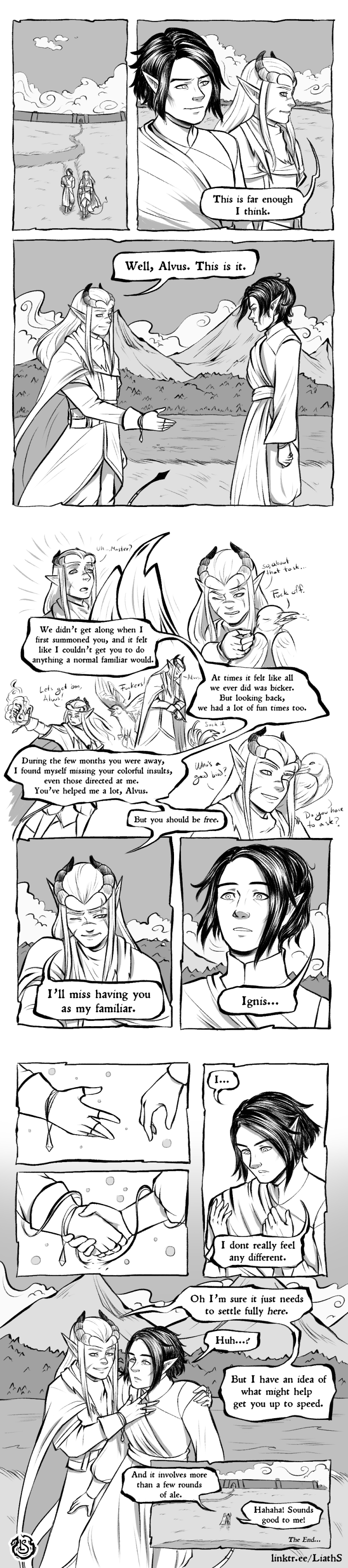 To give context, Ignis, the tiefling sorcerer, for a long time had a white raven familiar, Alvus (who was in reality, a demon in disguise, though Ignis found that out sometime before these events took place). At one point, Alvus made a request to Ignis to acquire him a human like body, which Ignis managed to do (a long story) through a custom spell similar to a clone. He let him off to enjoy being a half-elf for a while, not calling up on him while he dealt with dangerous business involving hags and other BBEG after they kidnapped some of his friends, but once he was done, he returned to the city where Alvus was, and decided to set him free from the initial contract they still had as a mage and a familiar. Because Ignis is a wild magic sorcerer (the surge happens more often than in general, and due to certain events, even when he casts cantrips or rituals), they went out to a safe place outside of the city in order to cancel the contract.Another comic based on the events of the session. To give context, Ignis, the tiefling sorcerer, for a long time had a white raven familiar, Alvus (who was in reality, a demon in disguise, though Ignis found that out sometime before these events took place). At one point, Alvus made a request to Ignis to acquire him a human like body, which Ignis managed to do (a long story) through a custom spell similar to a clone. He let him off to enjoy being a half-elf for a while, not calling up on him while he dealt with dangerous business involving hags and other BBEG after they kidnapped some of his friends, but once he was done, he returned to the city where Alvus was, and decided to set him free from the initial contract they still had as a mage and a familiar. Because Ignis is a wild magic sorcerer (the surge happens more often than in general, and due to certain events, even when he casts cantrips or rituals), they went out to a safe place outside of the city in order to cancel the contract.0 Comments 0 Shares 3 Views -