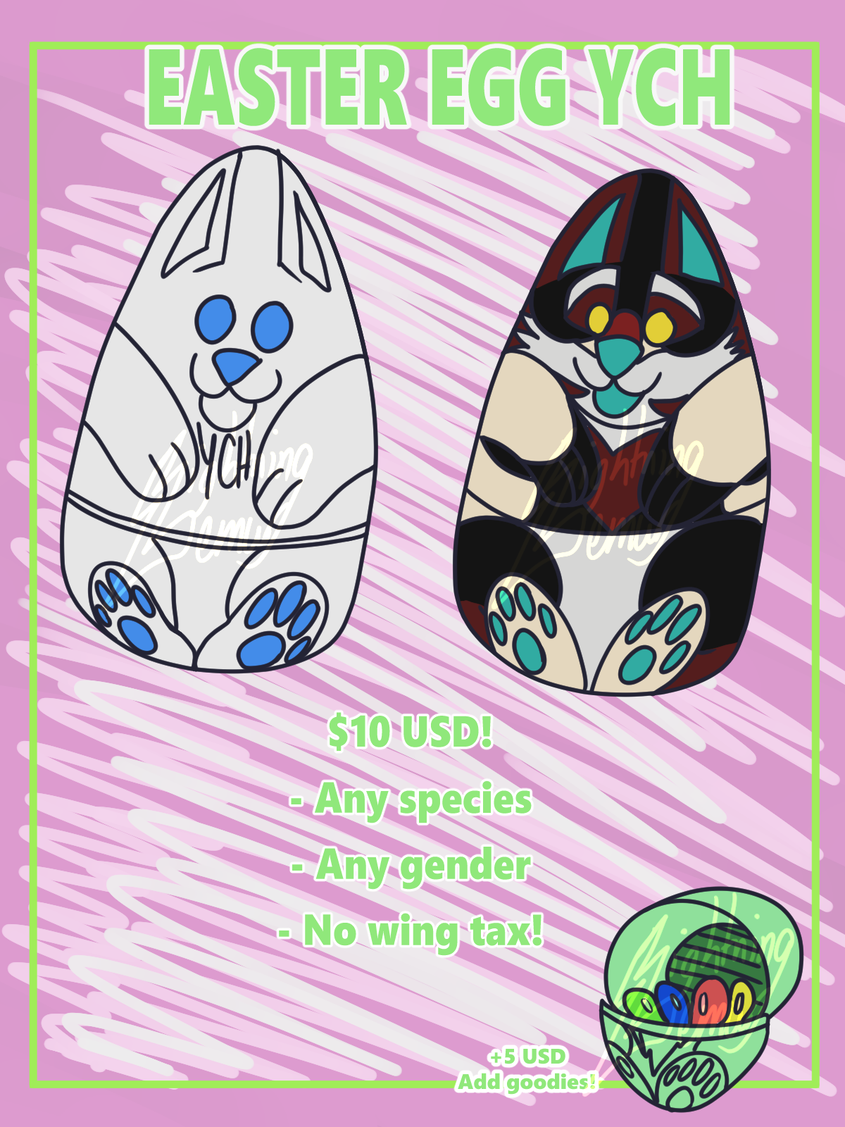 Here is a YCH where you can get your fursona made into a fun Easter egg to collect. Only $10 for this little YCH. Want to show off what people get if they find you? For an additional 5 bucks, you can do just that! It can be anything- jelly beans, taffy, hard candies. You decide! I'll be taking 5 spots for this- turnaround will be super quick (3 days max). Contact me at starthelemur@gmail.com to snag a slot today.Here is a YCH where you can get your fursona made into a fun Easter egg to collect. Only $10 for this little YCH. Want to show off what people get if they find you? For an additional 5 bucks, you can do just that! It can be anything- jelly beans, taffy, hard candies. You decide! I'll be taking 5 spots for this- turnaround will be super quick (3 days max). Contact me at starthelemur@gmail.com to snag a slot today.0 Comments 0 Shares 13 Views