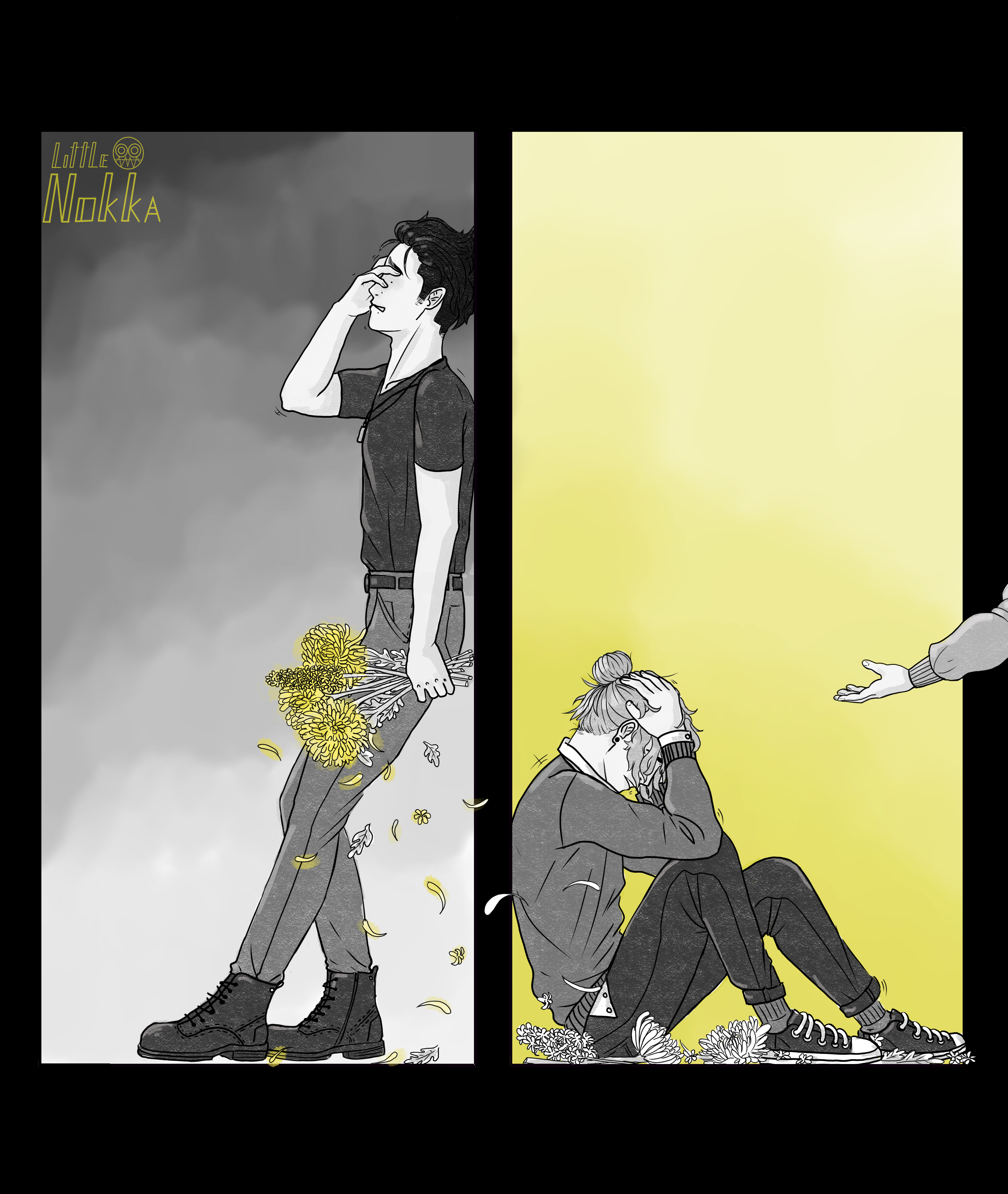 The symbolism I used was that Satoshis yellow flowers stand as a meaning for: jealousy, neglected love and heart left to desolation. While on the other hand Akitos flowers are white and tattered on the ground and stand, ironically, for: love, loyalty and 'i pray for you'. Flowers he feels he has no right to give to Satoshi anymore for what he has done.The other drawing i did during my october art challenge. For this i drew my OC Akito (on the right) and a friends OC Satoshi (on the left) with a piece representing their breakup and the mistakes my boy has done while also a hope for the future with the reached out arm. The symbolism I used was that Satoshis yellow flowers stand as a meaning for: jealousy, neglected love and heart left to desolation. While on the other hand Akitos flowers are white and tattered on the ground and stand, ironically, for: love, loyalty and 'i pray for you'. Flowers he feels he has no right to give to Satoshi anymore for what he has done.0 Comments 0 Shares 6 ViewsPlease log in to like, share and comment! -