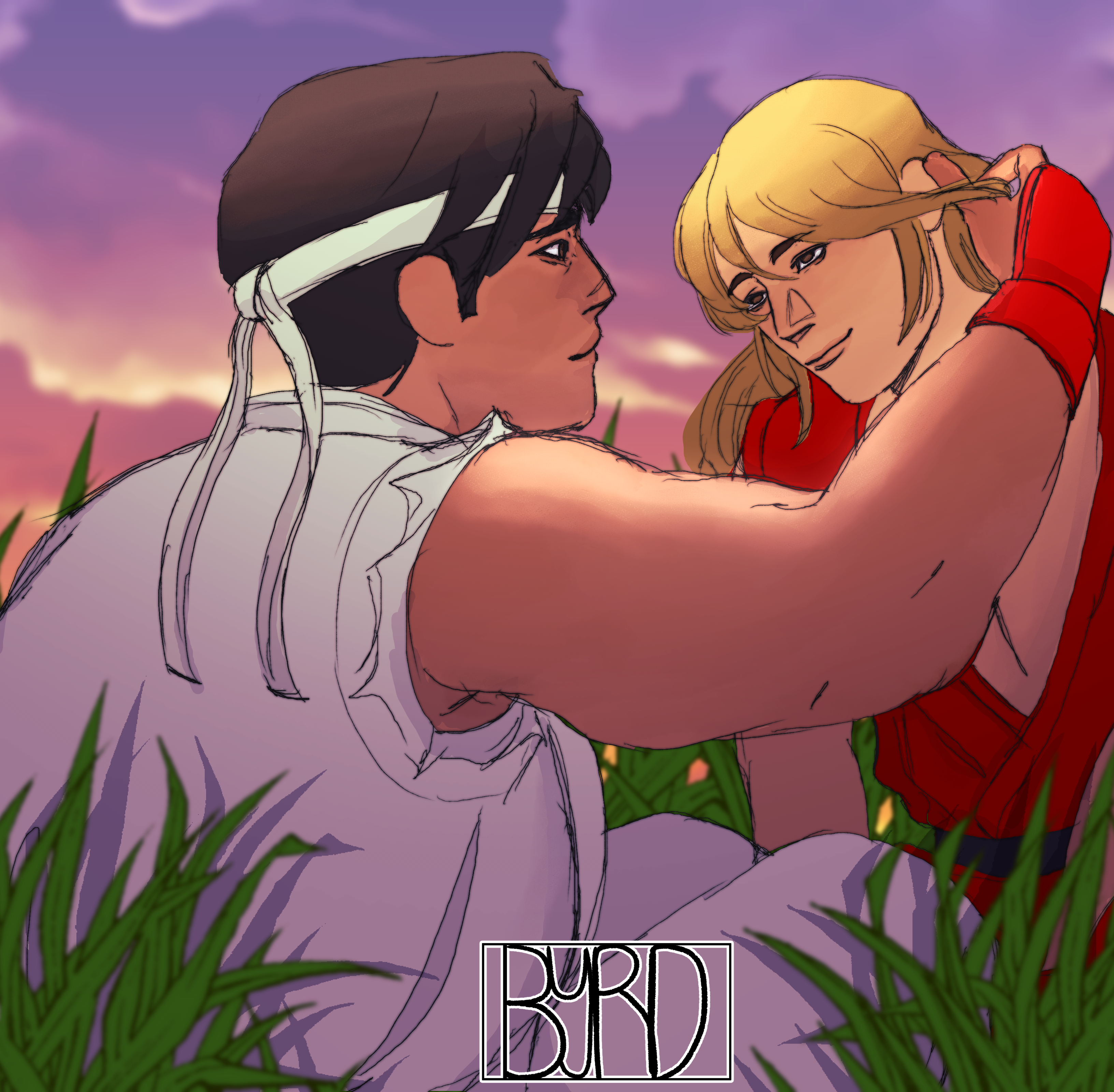 Image ID: A drawing of Ryu and Ken from Street Fighter as they appear in Street Fighter Alpha, they are sitting in a grassy field, and Ryu is tucking a strand of hair behind Ken's ear. He is smiling at Ken and Ken is smiling back at him. The background depicts a sunset occurring behind them. My signature is in the bottom middle of the image stating BYRD in all caps.