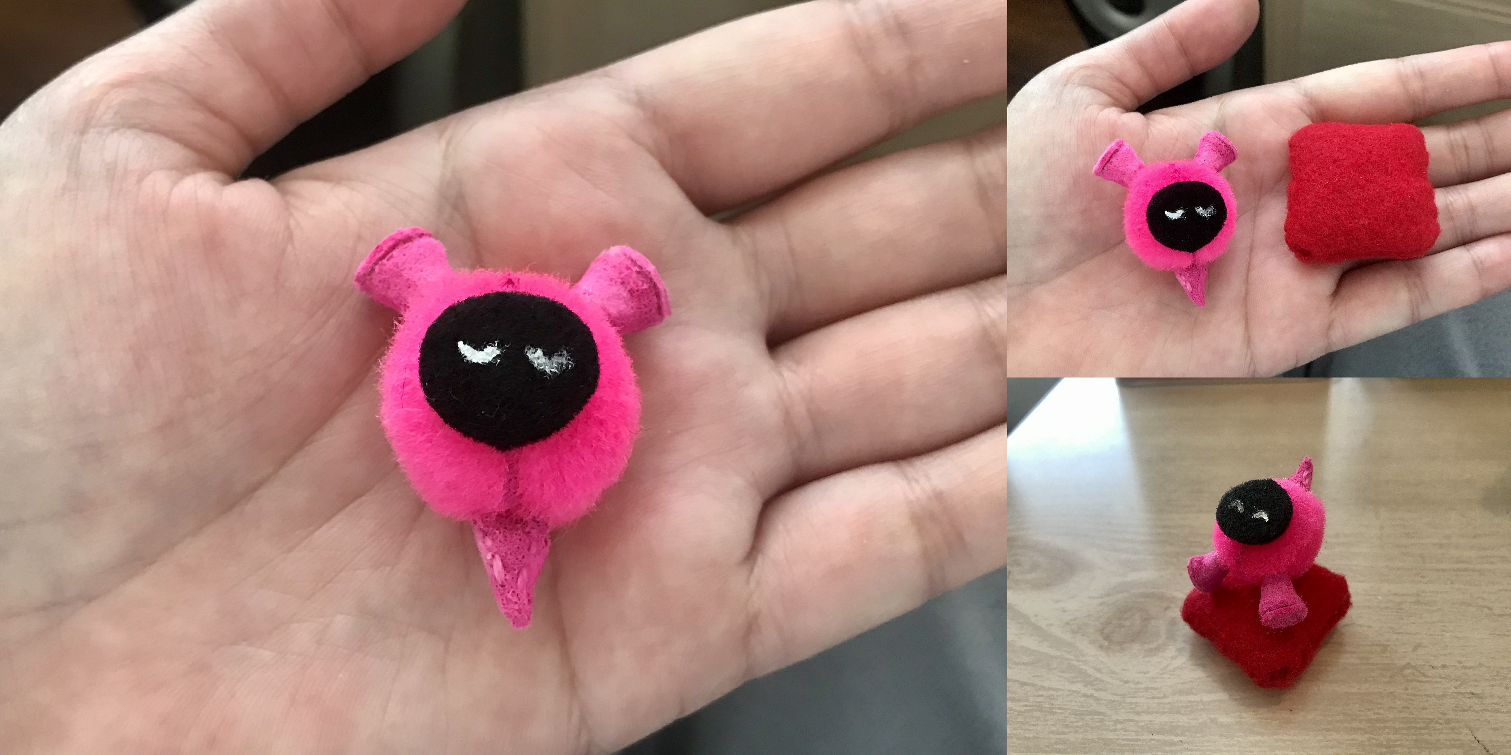 My first artwork of the year, and also my very first post here on InkBlot: A model of Pecharunt from _Pokémon Scarlet and Violet_. After finishing the epilogue, I had to make this! I even included the little red pillow/cushion he sits on before the story starts. I didn't have the right shade of pink felt for the ears and tail, so I had to dye it with acrylic paint. Pecharunt is 1 11/16 inches (4.29 cm) tall, and the pillow measures 1 5/16 inches (3.33 cm) on all sides and is 5/8 inches (1.59 cm) thick.