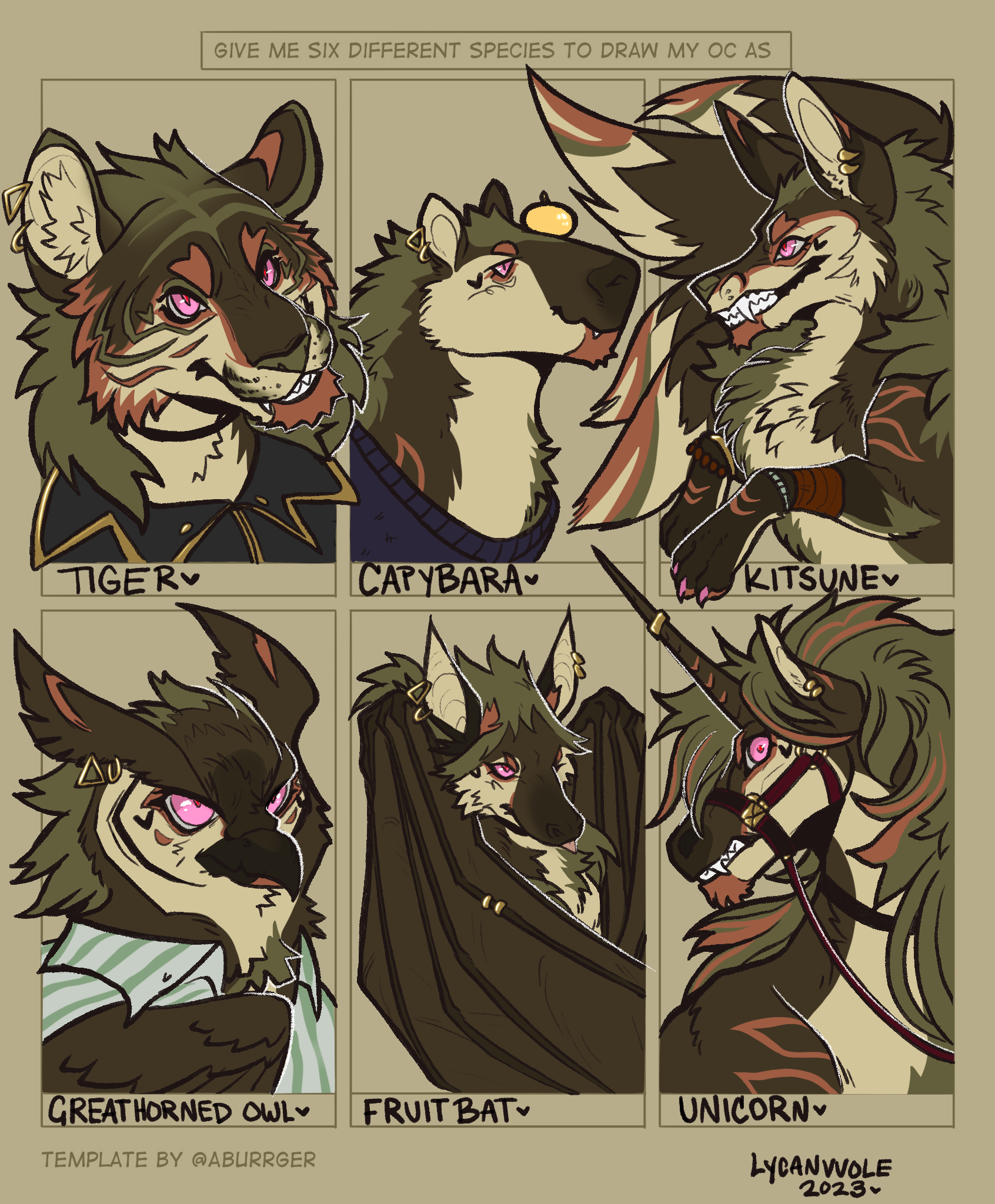 my sona is originally a sergal, so i drew him as a tiger, capybara, kitsune, horned owl, bat, and a unicorn! <3my sona is originally a sergal, so i drew him as a tiger, capybara, kitsune, horned owl, bat, and a unicorn! <30 Comments 0 Shares 2 Views