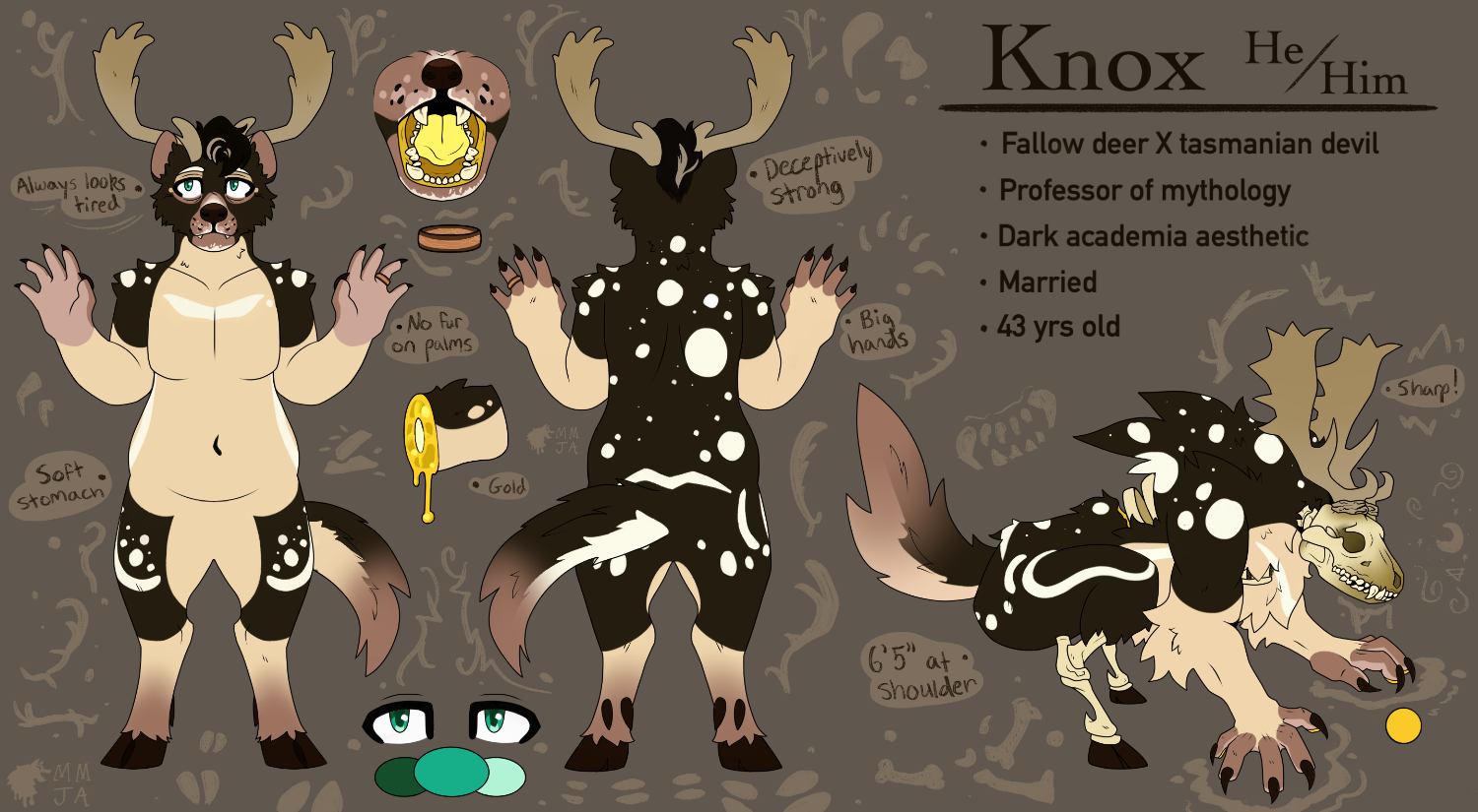It always bothered me that with the old design he was like 40 and looked mid 20s. Plus I wanted him to be sturdier since he's older + he's mostly tasmanian devil. So this time around I made him a lil chubby, adjusted some colors, and added in some grey spots around his muzzle and in his hair. Lastly, I made his monster form more quadruped that it originally was. It used to be purely anthro but I felt like it was creepier to be more on all fours.I finally finished up this slight revamp of Knox's design! It always bothered me that with the old design he was like 40 and looked mid 20s. Plus I wanted him to be sturdier since he's older + he's mostly tasmanian devil. So this time around I made him a lil chubby, adjusted some colors, and added in some grey spots around his muzzle and in his hair. Lastly, I made his monster form more quadruped that it originally was. It used to be purely anthro but I felt like it was creepier to be more on all fours.0 Comments 0 Shares 5 Views -