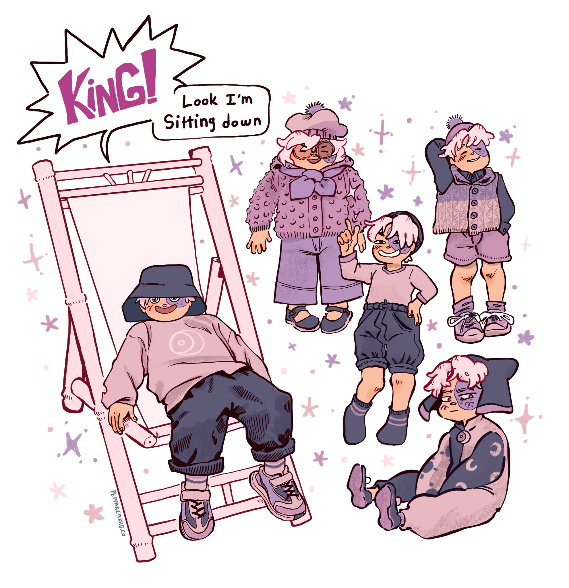 Image Description: 5 images of the Collector from the owl house, where he's wearing a different outfit in each one. One of the images feature their canon outfit, but the rest are a variety of different children's clothing. In the image to the utmost left, The collector is sitting down in a chair made out of bamboo, wearing a bucket hat, sneakers, a long-armed shirt with his necklace symbol on, and a pari of dark pants. In this image he is shouting "KING! look I'm sitting down". In another, The collector is wearing a beret, a scarf, long wide pants, black shoes and a cardigan with dots on. in the last two images he's wearing shorts, socks and a hat. In one of them he's wearing a shirt and a cardigan on top, in the other just a simple shirt. All outfit follow a very purple colorscheme.The collector in different outfits ! Image Description: 5 images of the Collector from the owl house, where he's wearing a different outfit in each one. One of the images feature their canon outfit, but the rest are a variety of different children's clothing. In the image to the utmost left, The collector is sitting down in a chair made out of bamboo, wearing a bucket hat, sneakers, a long-armed shirt with his necklace symbol on, and a pari of dark pants. In this image he is shouting "KING! look I'm sitting down". In another, The collector is wearing a beret, a scarf, long wide pants, black shoes and a cardigan with dots on. in the last two images he's wearing shorts, socks and a hat. In one of them he's wearing a shirt and a cardigan on top, in the other just a simple shirt. All outfit follow a very purple colorscheme.0 Comments 0 Shares 6 Views -