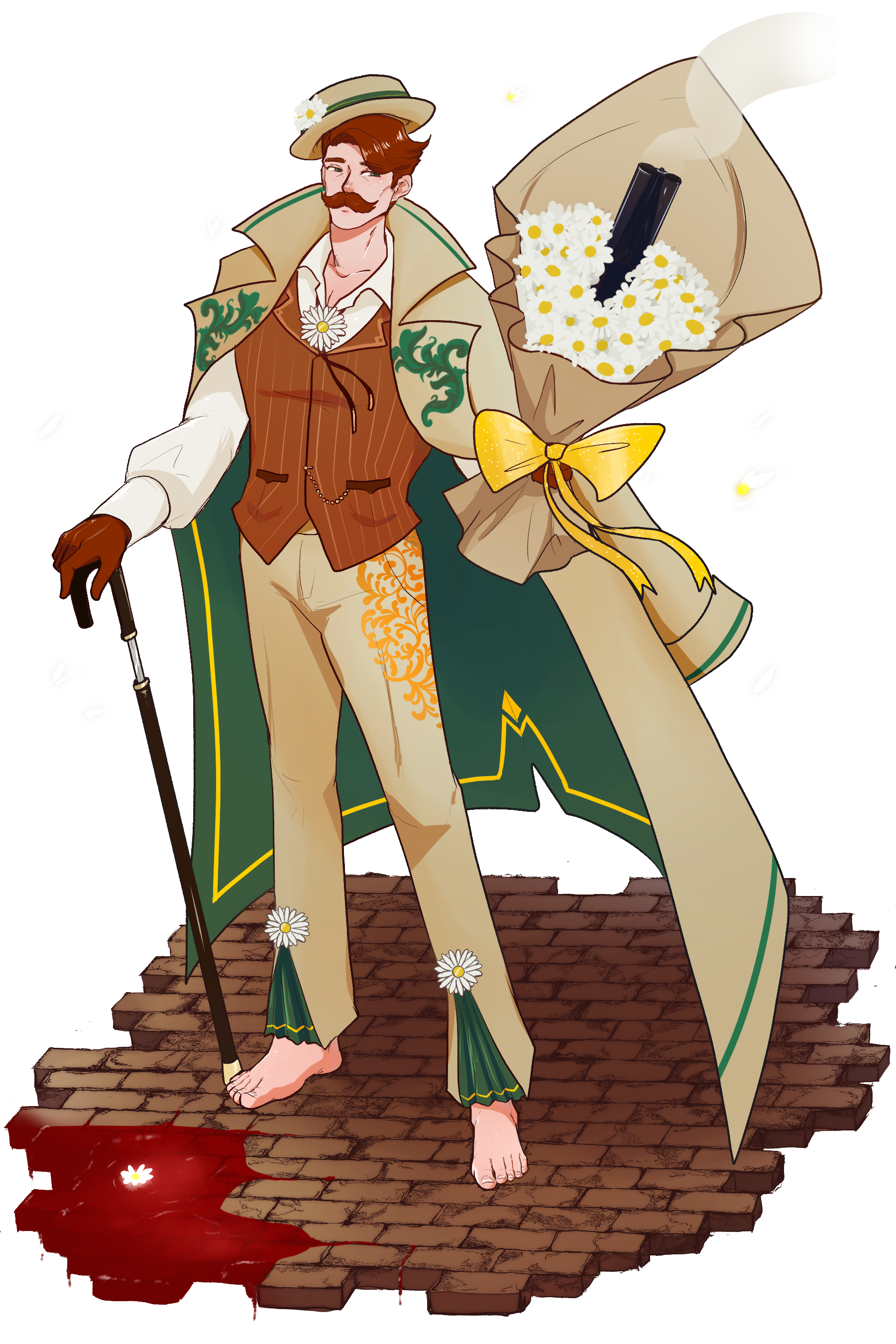This was an adopt from www.twitter.com/RCamerion! I own the OC, the art is hisThis mercenary travels the continent, taking coin from the highest of nobles to seek out targets. However, his main goal is justice, not greed. He will scope out his targets to ensure their capture or demise is beneficial to the people before acting. Seemingly weak, he makes up for his lack of showy abilities with stealthy tactics. His main weapon of choice is a cane holding a sleek, sharp sword, but he also is one of the few to possess a firearm. This device uses a ruby to create explosions, propelling any material loaded into the barrel. Powders, metal shot, and other debris can be turned into a projectile force. His skill with weaponry isn't the only thing that makes him dangerous, though. His skin secretes a unique compound that, upon ingestion, becomes a sedative. Just as well, it also tastes like a floral tea, causing those exposed to want to consume more. All it takes is him shoving his toes into his target's mouth, and it's lights out in moments. This was an adopt from www.twitter.com/RCamerion! I own the OC, the art is his0 Comments 0 Shares 13 Views -