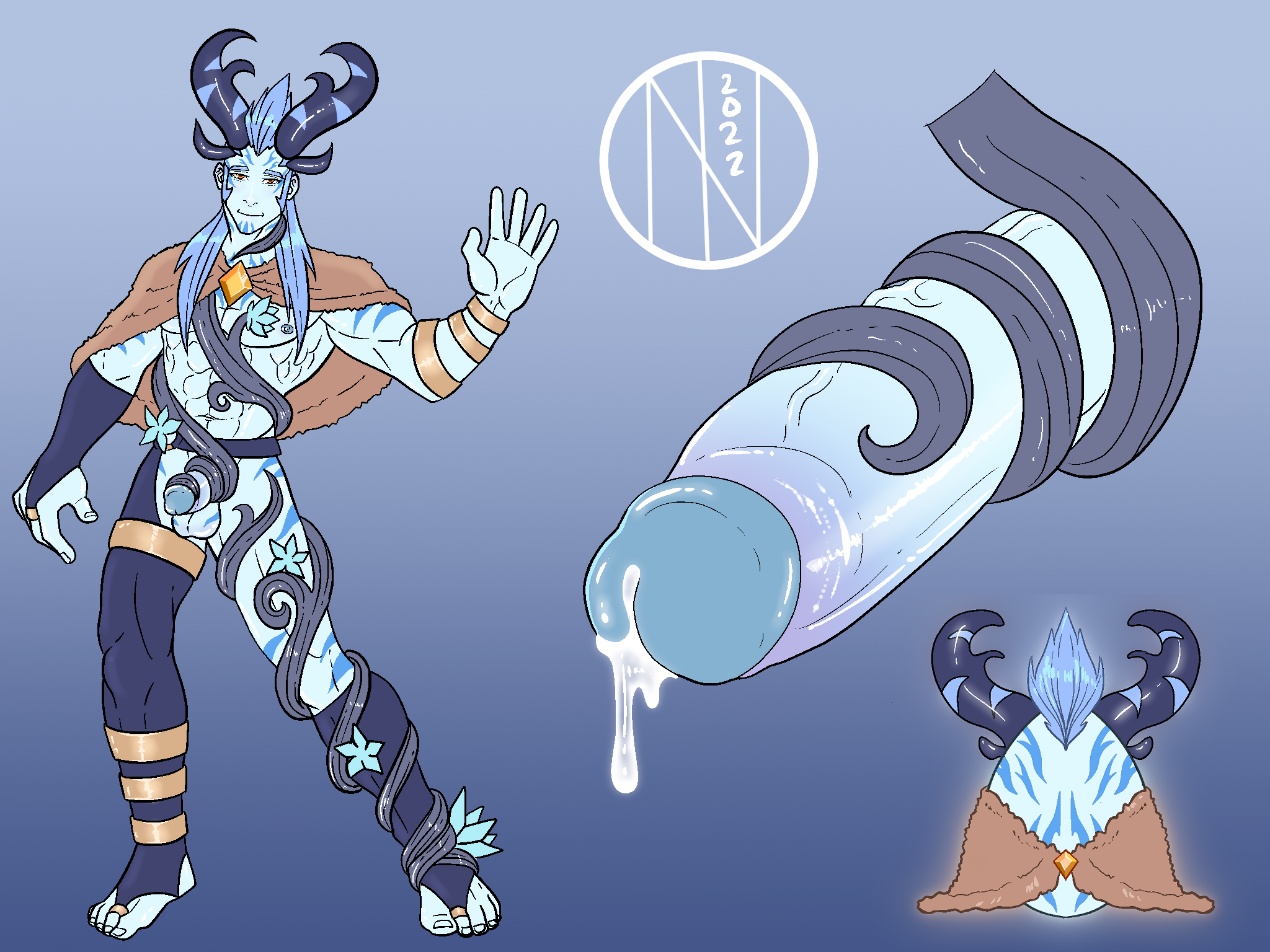 Credit for the design itself goes to OnigirisGrove on Twitter!It's unclear if this mysterious man was a human at birth. Little is known about him due to the fact he seems to be unwilling to communicate. The thick branches that cover his body seem to be attempting to grow further, but are stopped by the presence of golden bands on his body. He seems to possess the ability to create what are called 'Frost Flowers,' a delicate yet potent plant which is excellent at reducing body temperature if fevered, yet can also be made to sharpen in defense. Some have claimed he is fond of sex, the vine around his shaft providing fantastic pleasure, yet this male remains eerily quiet. Whether he is a friend or enemy remains a mystery... This design is co-owned by me and my friend RyanCyanWolf/RyanWolfie Credit for the design itself goes to OnigirisGrove on Twitter!0 Comments 0 Shares 12 Views -