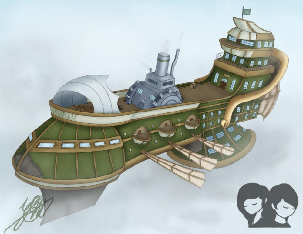 I haven't done art of something that isn't a fictional character in a long time, but this ship might as well be one, considering its importance in my story, Parallels. This is the Barracupid, a decommissioned steam-powered airship that was bought at an auction for Priscilla Sauveterre by her father for her high school graduation. It's named after the barracuda, due its appearance, and Cupid, due to its "fins" being "wings". Priscilla uses it to travel around the world and to find inspiration for her art.