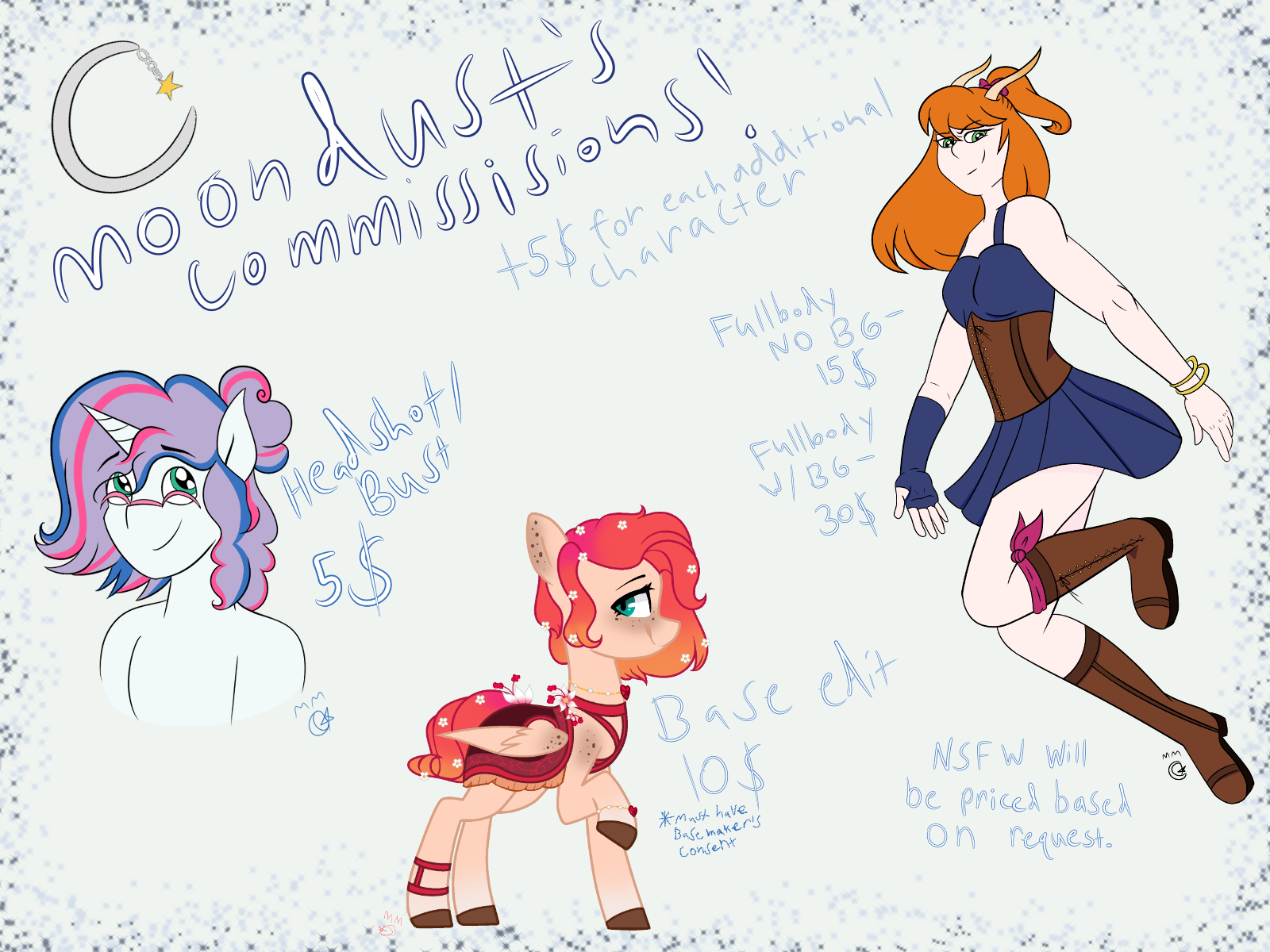 Here's my commission sheet with my commission prices! If you're interested in something that isn't listed here, feel free to ask about it, I'm not limited in what I can draw. All bases used must have the basemaker's permission, either in their rules or via asking them directly, I won't use bases that aren't allowed for commission use.Here's my commission sheet with my commission prices! If you're interested in something that isn't listed here, feel free to ask about it, I'm not limited in what I can draw. All bases used must have the basemaker's permission, either in their rules or via asking them directly, I won't use bases that aren't allowed for commission use.0 Comments 0 Shares 5 Views
