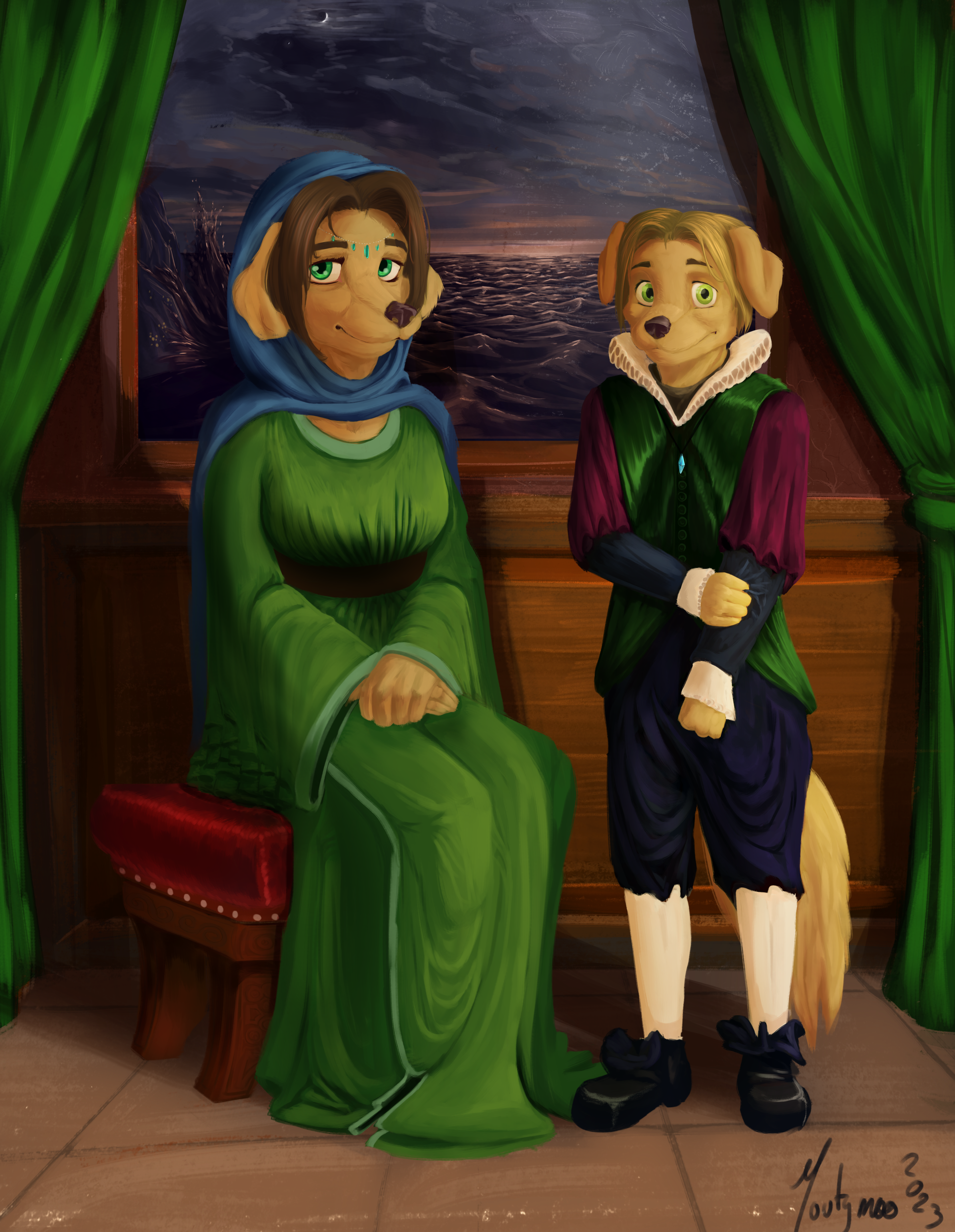 This is the first in a series of paintings/drawings, in which i portray my characters in their younger years. Please enjoy this imitation of an oil painting, inspired by the Flemish Renaissance !Trisha Thanerfind left Os'Nieh for Aesken when she married Gort Feigenwell at 21 years old. They were both from wealthy merchant families and inheritted the skills and the money to open trade in the Eskenic capital. Their commercial empire seed himself in the city and soon their name became well known and respected throughout the burg. Thanks to his fascination and knowledge for ore and minerals, Gort made it his speciallity : opening mines and quaries in the Farangian mountains, buying deposits from his weaker competitors and squashing opposition with sheer worth, and a few hired arms. This bourgeois familly implanted itself into the higher spheres of the capital, and even gained some toehold into the imperial council, by creating a merchant guild. Alas, a few years after their son was born, Gort died from disease and left his now widow Trisha to manage their little empire alone. She was not disheartened however, and even while raising her child, she was still able to dominate the Ore markets all throughout Parcimia. This is the first in a series of paintings/drawings, in which i portray my characters in their younger years. Please enjoy this imitation of an oil painting, inspired by the Flemish Renaissance !0 Comments 0 Shares 21 Views -