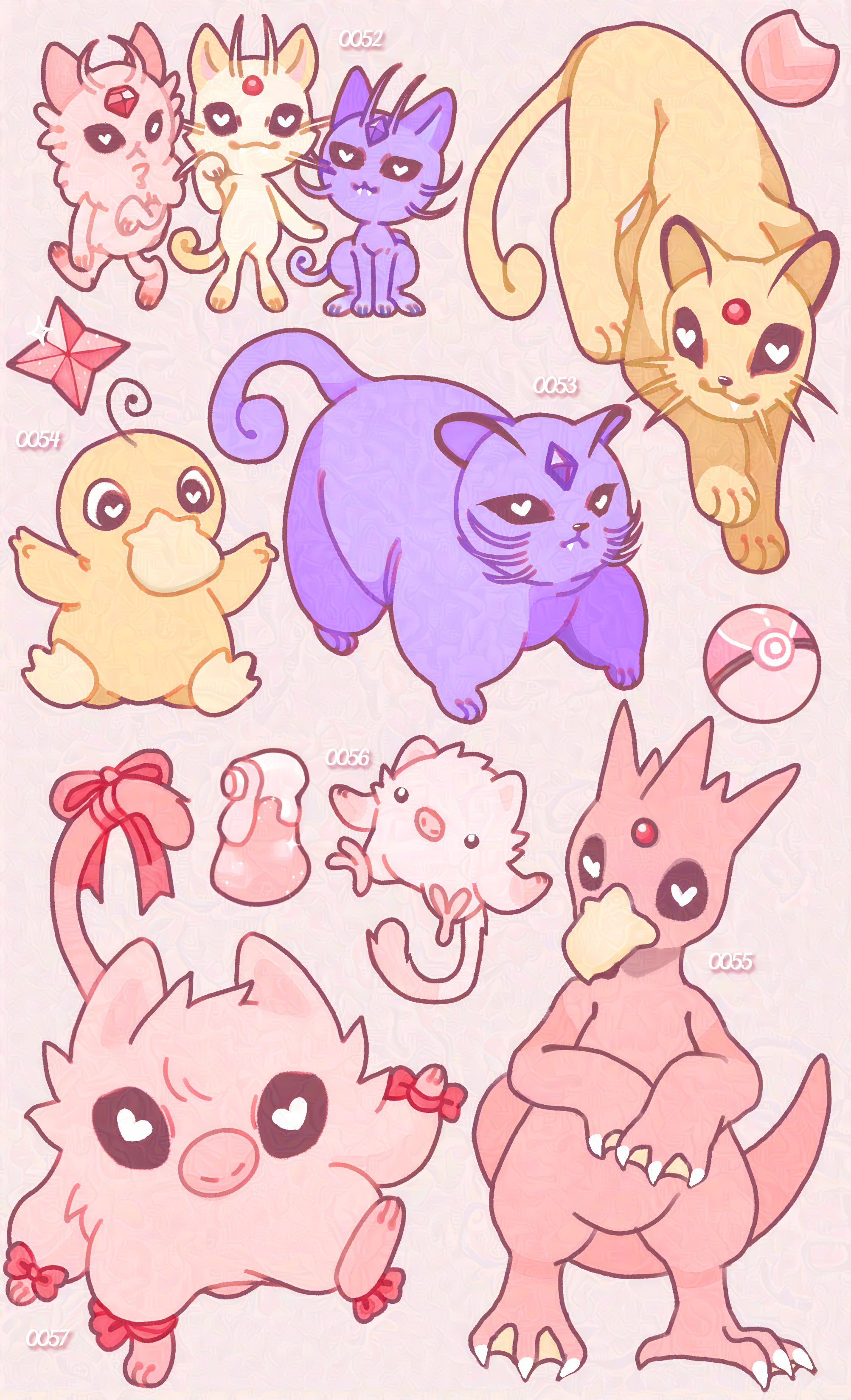 Pinkumon is my series where I redraw or redesign pokemon in my personal favorite aesthetics and colors!Pinkumon 52 to 57! - Meowth Persian, Kantonian Alolan & Galarian - Psyduck Golduck - Mankey Primeape Pinkumon is my series where I redraw or redesign pokemon in my personal favorite aesthetics and colors!0 Comments 0 Shares 81 Views -
