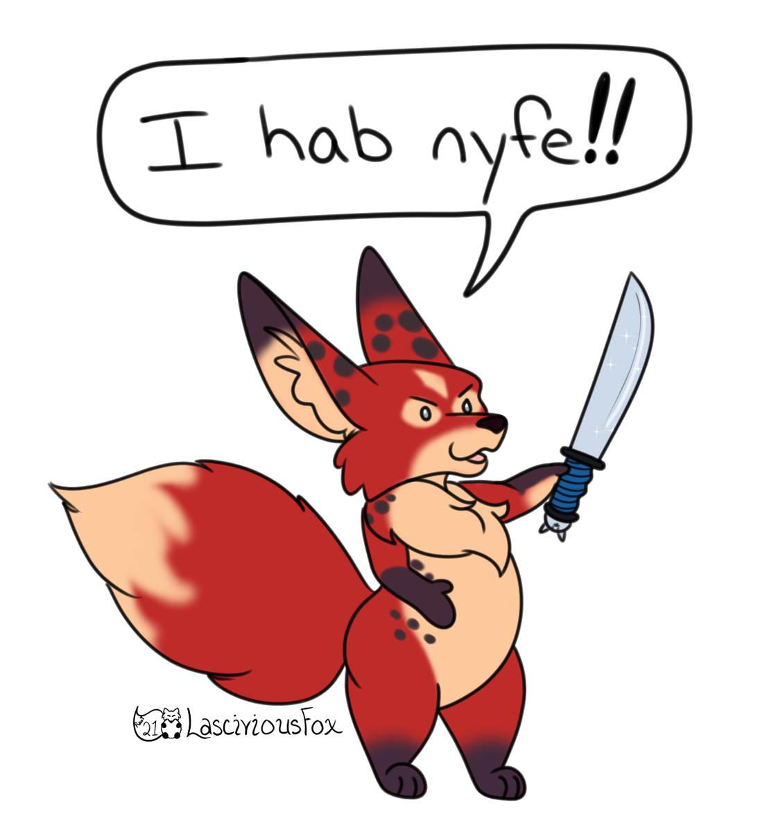 Alt Text: Chibi of a red, tan and black vulpera / fennec fox standing on two legs. Grinning mischievously, she's holding a large, sparkly knife with blue-wrapped hilt and declaring "I hab nyfe!!"