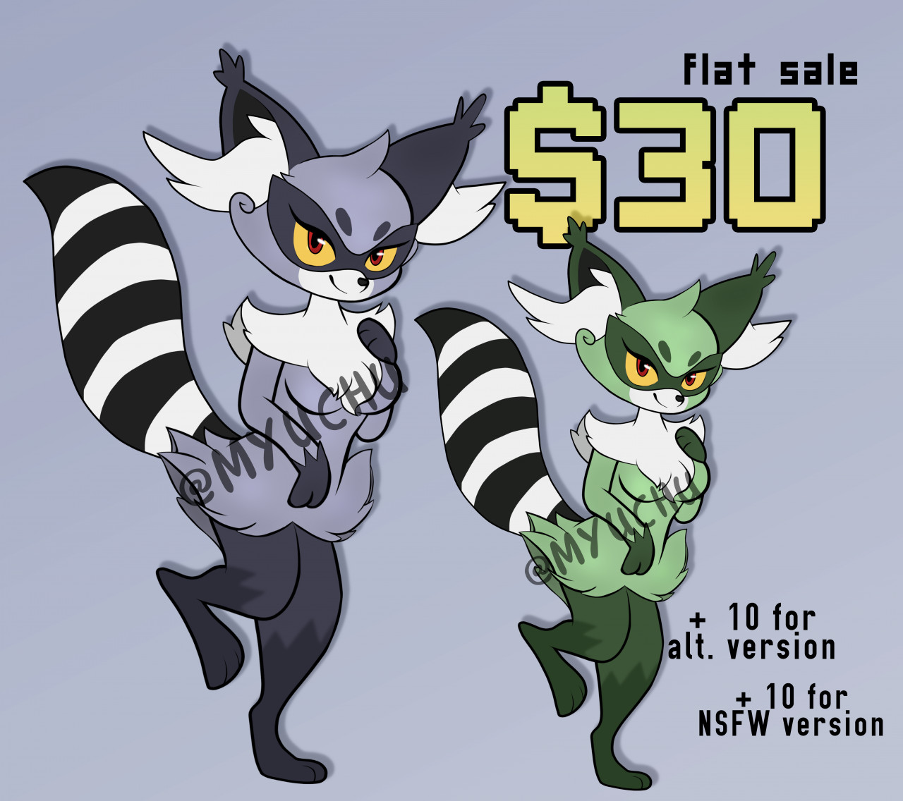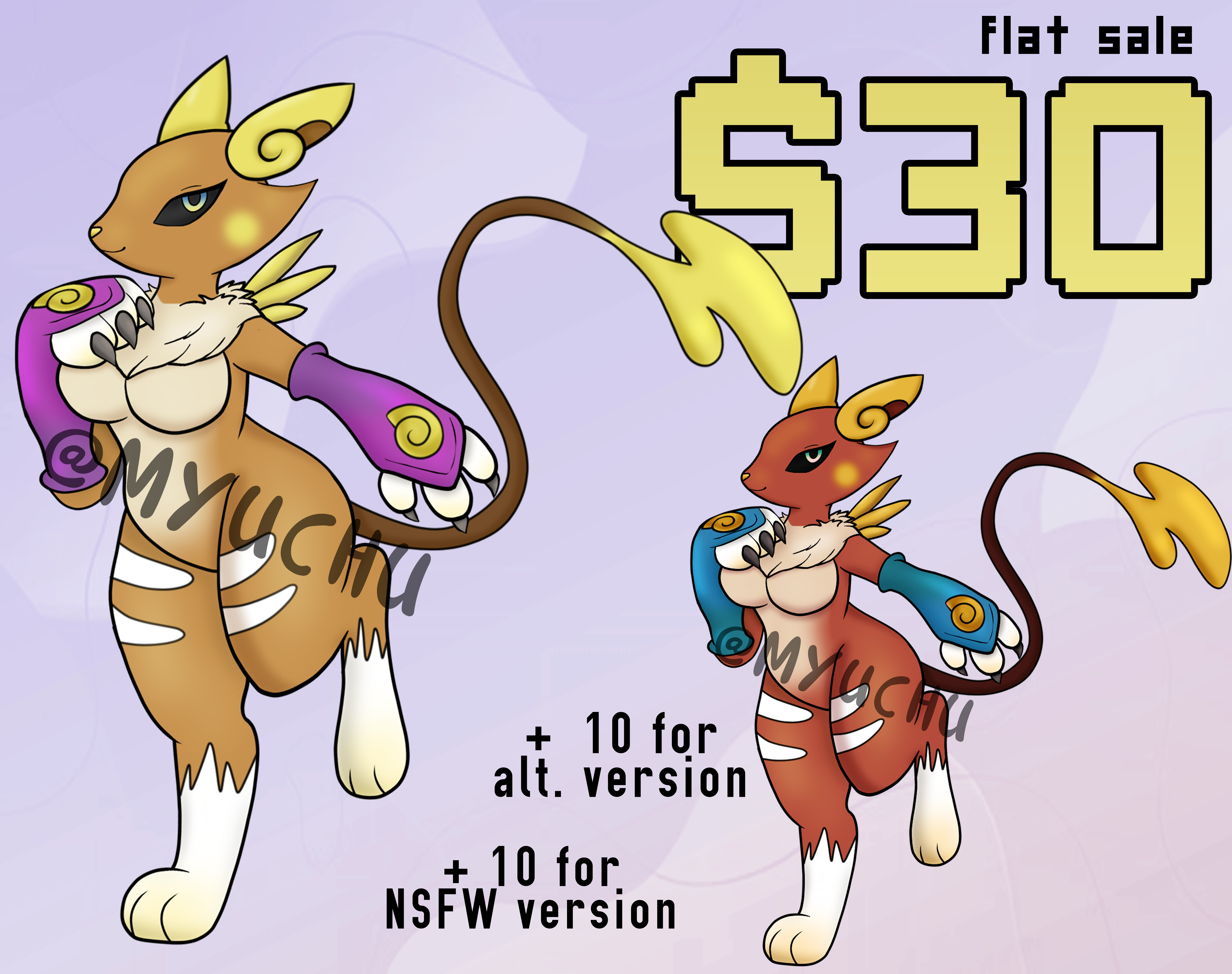 DO NOT RESELL FOR MORE THAN YOU PAID! Credit to me is much appreciated! :)🌩️ RENAMON/ALOLAN RAICHU ADOPTABLE 🌩️ FLAT SALE :$30 +$10 for alt version +$10 for NSFW version (I accept USD via paypal!) Comment or dm me to claim! After payment is received I will send you the full resolution png of the character with no watermarks! DO NOT RESELL FOR MORE THAN YOU PAID! Credit to me is much appreciated! :)0 Comments 0 Shares 27 Views
