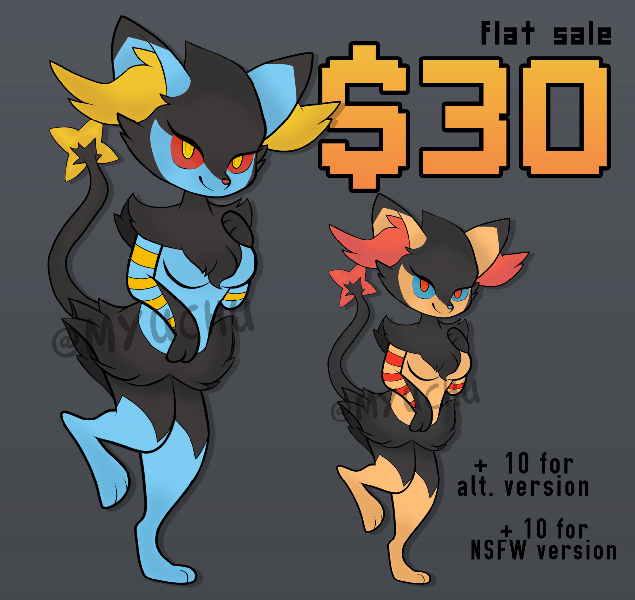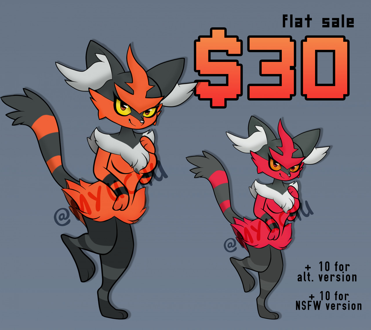 DO NOT RESELL FOR MORE THAN YOU PAID! Credit to me is much appreciated! :)⭐️ BRAIXEN/LUXRAY FUSION ⭐️ FLAT SALE :$30 +$10 for alt version +$10 for NSFW version (only includes nipples) (I accept USD via paypal!) Comment or dm me to claim! After payment is received I will send you the full resolution png of the character with no watermarks! DO NOT RESELL FOR MORE THAN YOU PAID! Credit to me is much appreciated! :)0 Comments 0 Shares 26 Views -