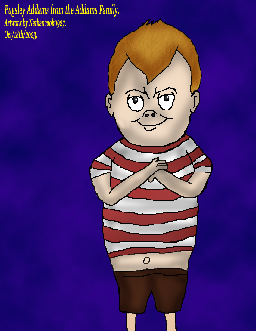 Pugsley Addams from the Addams Family Belongs to MGM & Universal Pictures.Got to work on a Fan Artwork of Pugsley Addams from the Addams Family, Pugsley is Gomez & Morticia's Son and Wednesday's Little brother who she like to tortures, Pugsley is very good with explosives, and sometimes he tries to get back at his Sister Wednesday but she outsmarts him like the Road Runner to the Coyote in Looney Tunes. Pugsley Addams from the Addams Family Belongs to MGM & Universal Pictures.0 Comments 0 Shares 54 Views -