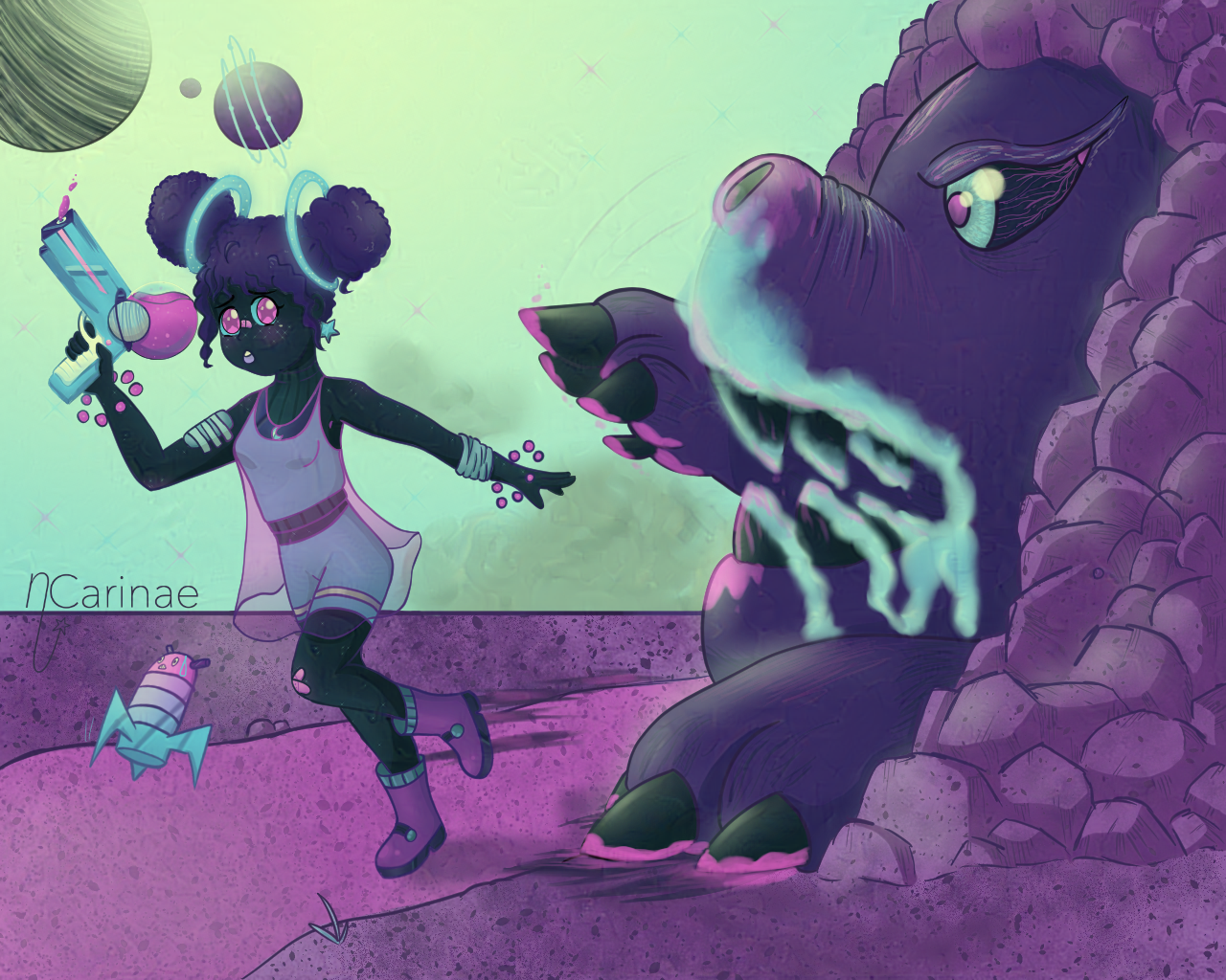 (July, 2018) Space girl escaping from a moster. I made this for a contest, they give me a palette and a theme and we had to make an illustration with it. I was very proud becuase it was my fisrt time doing something with a limited palette and a beast! I was proud even how the rocks look haha(July, 2018) Space girl escaping from a moster. I made this for a contest, they give me a palette and a theme and we had to make an illustration with it. I was very proud becuase it was my fisrt time doing something with a limited palette and a beast! I was proud even how the rocks look haha0 Comments 0 Shares 10 Views