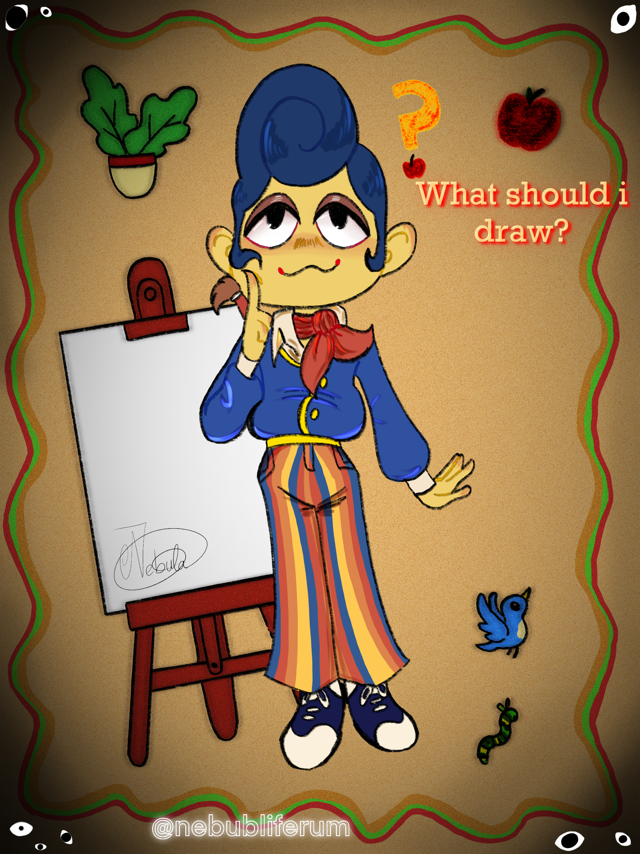 Wally wondering what he should draw.Mi primer post en inkblot :3 la verdad lo de estos últimos tiempos me preocupa como artista que esta empezando, pero que le voy a hacer, me gusta dibujar y quiero compartir mis obras con los demas :) Ire subiendo todos mis dibujos poco a poco, segun lo que me apetezca más. 🍎 Wally preguntandose que debería dibujar. -- My first post in inkblot :3 the truth is that in recent times I am worried as an artist who is starting, but what am I going to do, I like to draw and I want to share my works with others :) I will upload all my drawings little by little, according to what I feel like most. 🍎 Wally wondering what he should draw.0 Comments 0 Shares 7 Views -