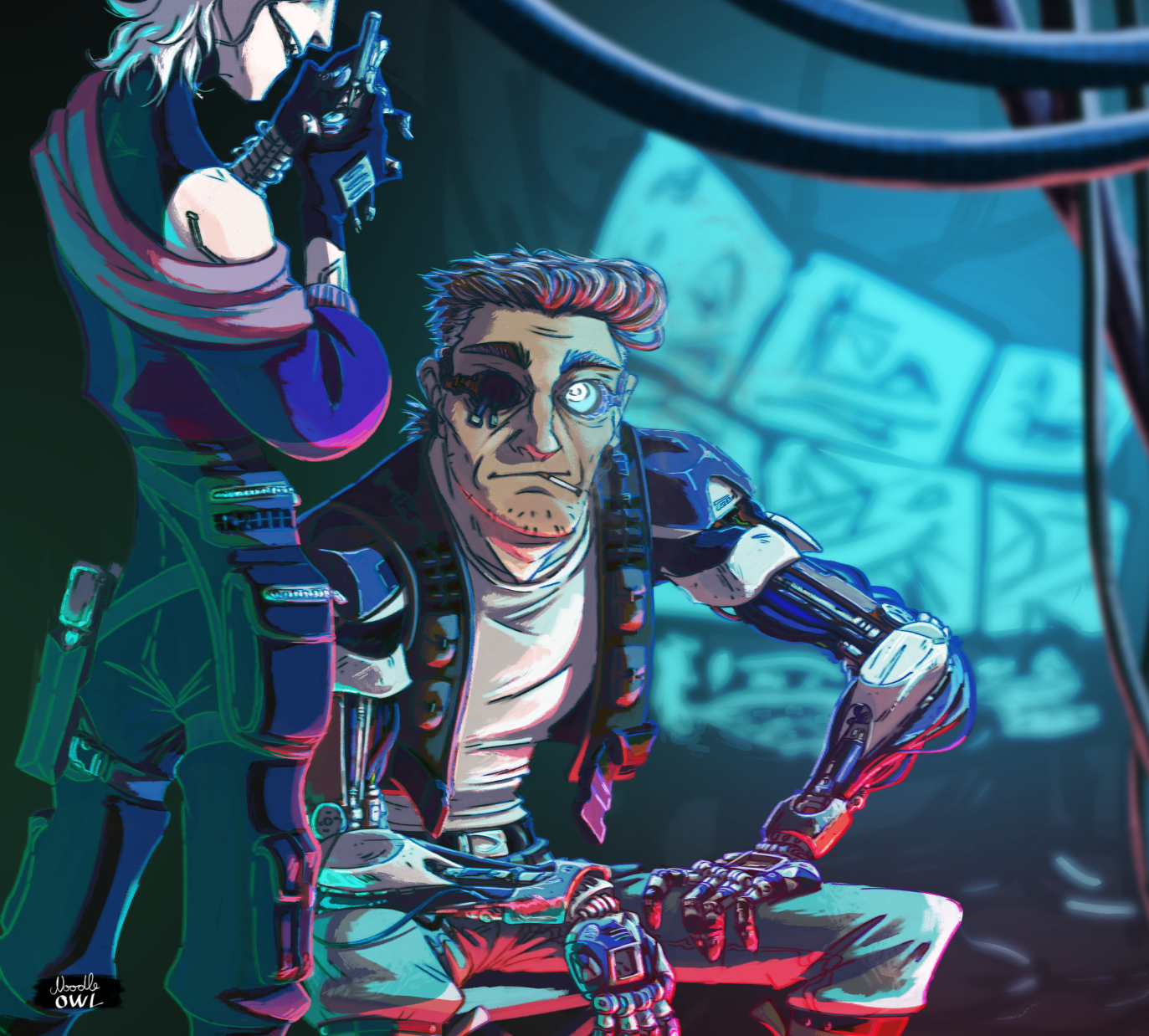 One or two sessions ago, our lovely GM threw this NPC at us who was just a treat (or just not a **** for a change, she would tell you). His name is Nicki and I love him. We bribed him and my PC fixed his cybereye, so he let us snoop around the shitty warehouses he works as a security guard at.This one took me a while to finish. It was never meant to be more than a doodle, oh well! One or two sessions ago, our lovely GM threw this NPC at us who was just a treat (or just not a dick for a change, she would tell you). His name is Nicki and I love him. We bribed him and my PC fixed his cybereye, so he let us snoop around the shitty warehouses he works as a security guard at.0 Comments 0 Shares 6 Views -
