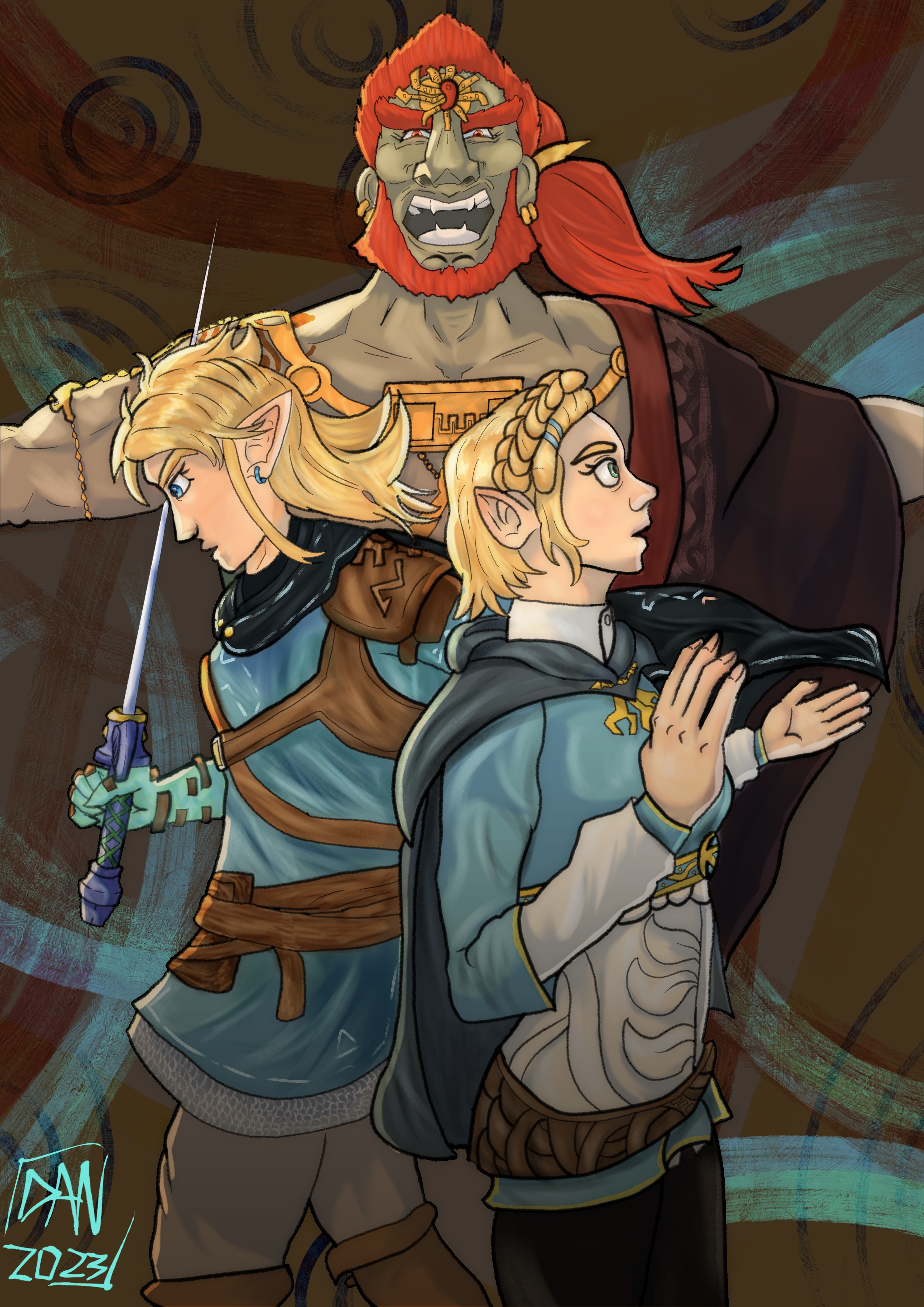 In the background blue and red swirls frame the characters as a triforce symbol stands behind, marked with spirals.Digital fan art I made after the most recent Tears Of The Kingdom trailer revealed Ganon. Shows Link, Zelda and Ganon in their newest designs standing in a triangular disposition. Link holds the Master Sword and looks down contemplating. Zelda is to his back, looking upwards in wonder and stretching her hands. Ganon stands behind, arms spread, laughing. In the background blue and red swirls frame the characters as a triforce symbol stands behind, marked with spirals.0 Comments 0 Shares 4 ViewsPlease log in to like, share and comment!