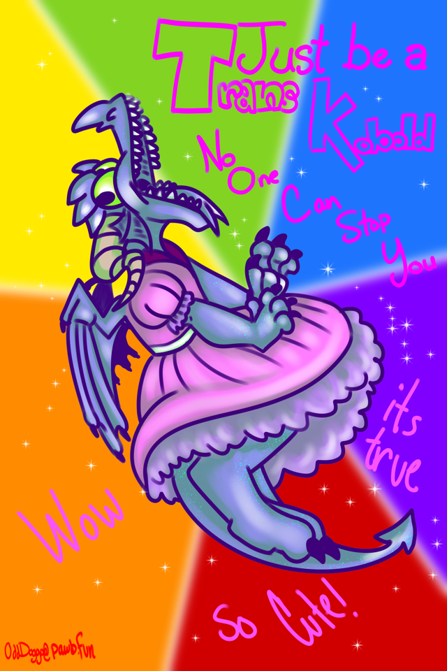 Image description: A blue winged kobold, wearing a pink dress, with thier mouth wide open on a rainbow background. Around them in neon pink are the words 'Just be a Trans Kobold' 'No One Can Stop You' 'Wow' So Cute! and 'its true'.!*screams in kobold* Min- any/all not a girl- just in a dress Image description: A blue winged kobold, wearing a pink dress, with thier mouth wide open on a rainbow background. Around them in neon pink are the words 'Just be a Trans Kobold' 'No One Can Stop You' 'Wow' So Cute! and 'its true'.!0 Comments 0 Shares 26 Views -