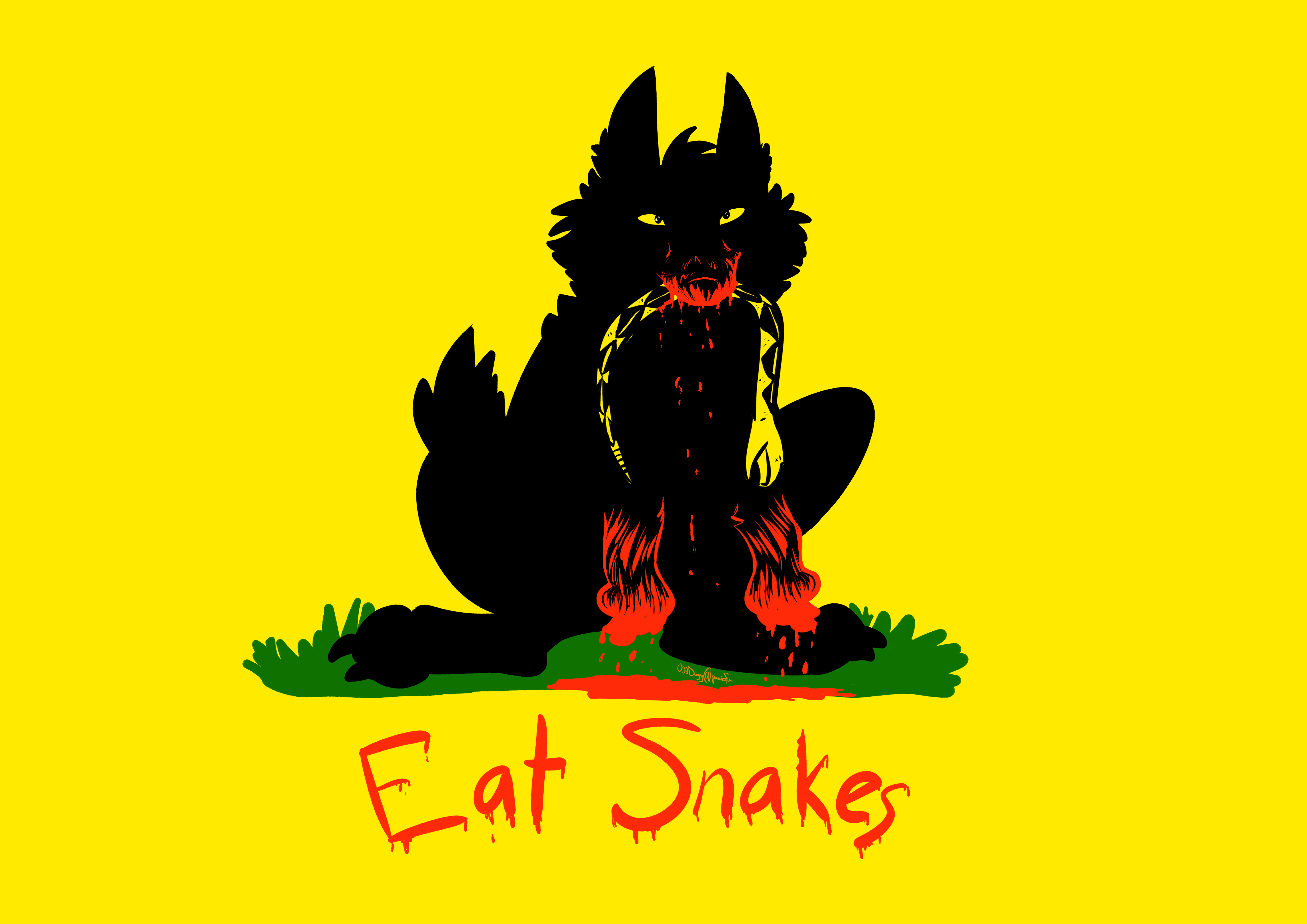Image description: On a yellow background, a wolf in black silhouette, holding a dead yellow rattle snake in its mouth, its paws and maw coveredwith blood. Also in red are teh words 'Eat Snakes" under the image.Image description: On a yellow background, a wolf in black silhouette, holding a dead yellow rattle snake in its mouth, its paws and maw coveredwith blood. Also in red are teh words 'Eat Snakes" under the image.0 Comments 0 Shares 27 Views