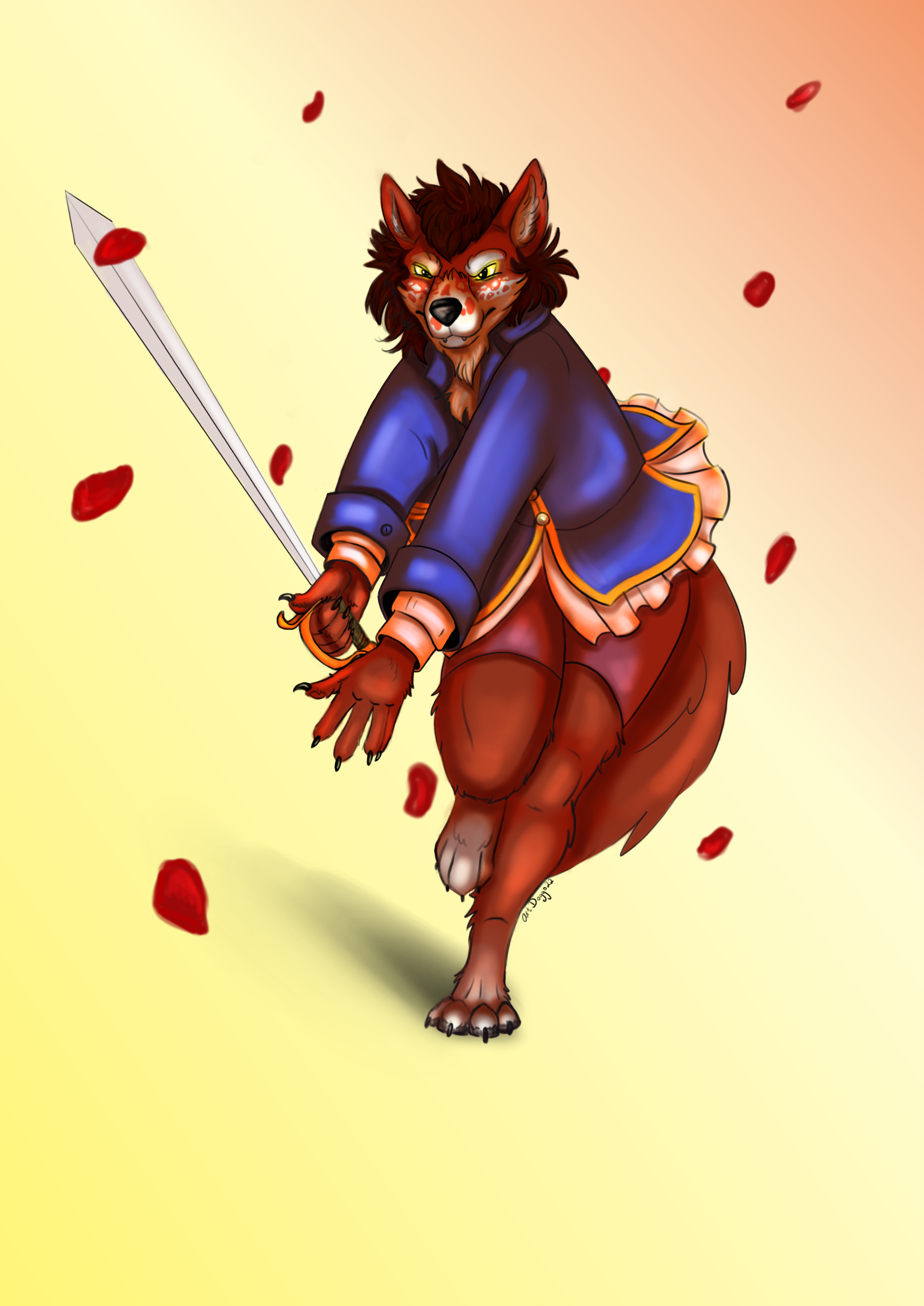 Image Description: Digital painting of a red fured anthro wolf, weilding a gold handled sword. They wear a blue coat with gold trim as well asa pair of short pink shorts.Gay sword wolf Image Description: Digital painting of a red fured anthro wolf, weilding a gold handled sword. They wear a blue coat with gold trim as well asa pair of short pink shorts.0 Comments 0 Shares 27 Views -
